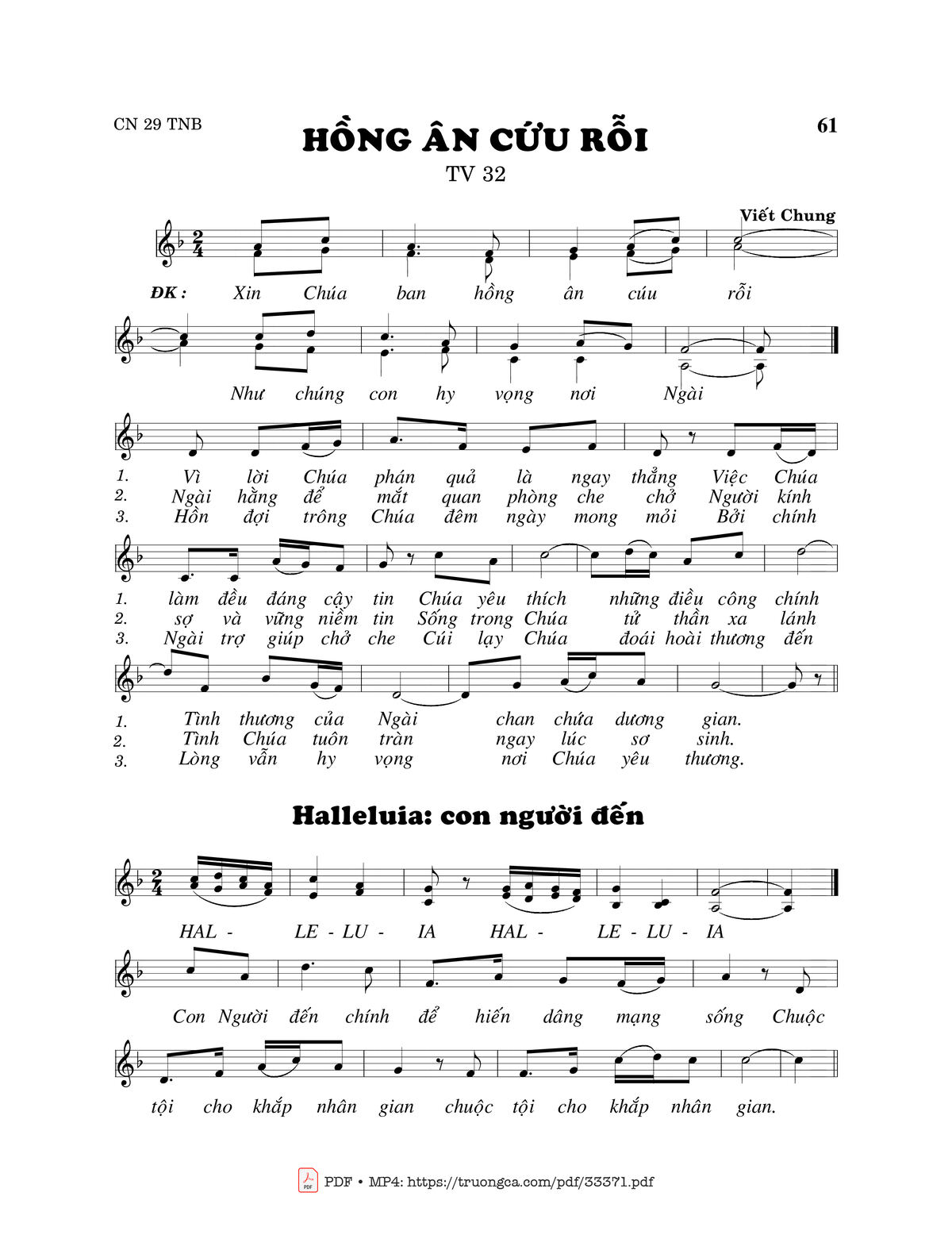 Sheet nhạc có nốt Thánh Vịnh 32, Hồng Ân Cứu Rỗi của nhạc sĩ Viết Chung và file PDF nốt nhạc đăng lên đây nhằm giúp các bạn xướng âm cho đúng nốt và hát thêm hay, chỉ mang tính chất tham khảo, không có mục đích thương mại. Bản quyền thuộc về tác giả và tổ chức nắm bản quyền, Truongca.com không giữ bất kỳ bản quyền của nội dung nào cả. Các bạn có thể tải về bản PDF chất lượng cao, gồm khuông nhạc có nốt với đường link file PDF bên trên.