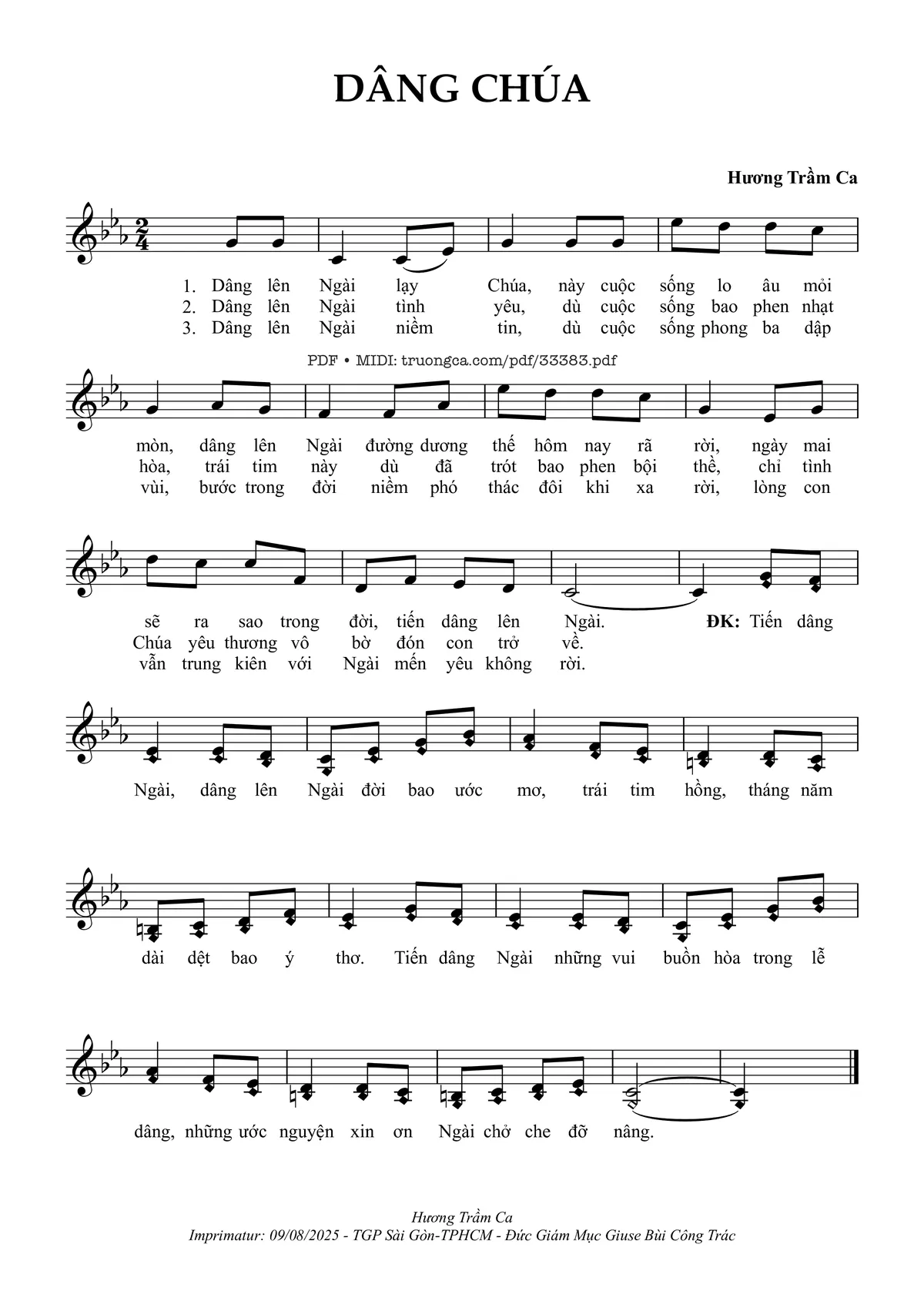 Sheet nhạc có nốt Dâng Chúa của nhạc sĩ Hương Trầm Ca và file PDF nốt nhạc đăng lên đây nhằm giúp các bạn xướng âm cho đúng nốt và hát thêm hay, chỉ mang tính chất tham khảo, không có mục đích thương mại. Bản quyền thuộc về tác giả và tổ chức nắm bản quyền, Truongca.com không giữ bất kỳ bản quyền của nội dung nào cả. Các bạn có thể tải về bản PDF chất lượng cao, gồm khuông nhạc có nốt với đường link file PDF bên trên.