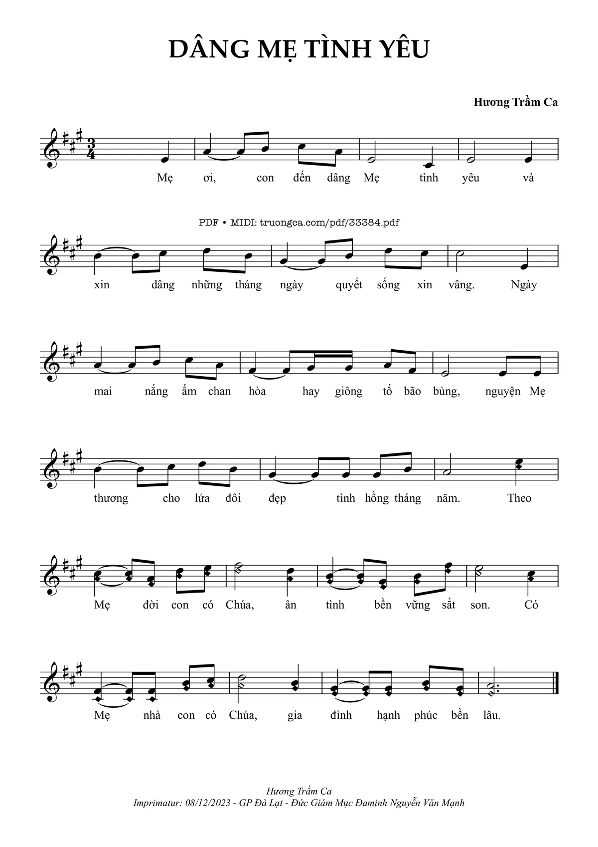 Sheet nhạc có nốt Dâng Mẹ Tình Yêu của nhạc sĩ Hương Trầm Ca và file PDF nốt nhạc đăng lên đây nhằm giúp các bạn xướng âm cho đúng nốt và hát thêm hay, chỉ mang tính chất tham khảo, không có mục đích thương mại. Bản quyền thuộc về tác giả và tổ chức nắm bản quyền, Truongca.com không giữ bất kỳ bản quyền của nội dung nào cả. Các bạn có thể tải về bản PDF chất lượng cao, gồm khuông nhạc có nốt với đường link file PDF bên trên.