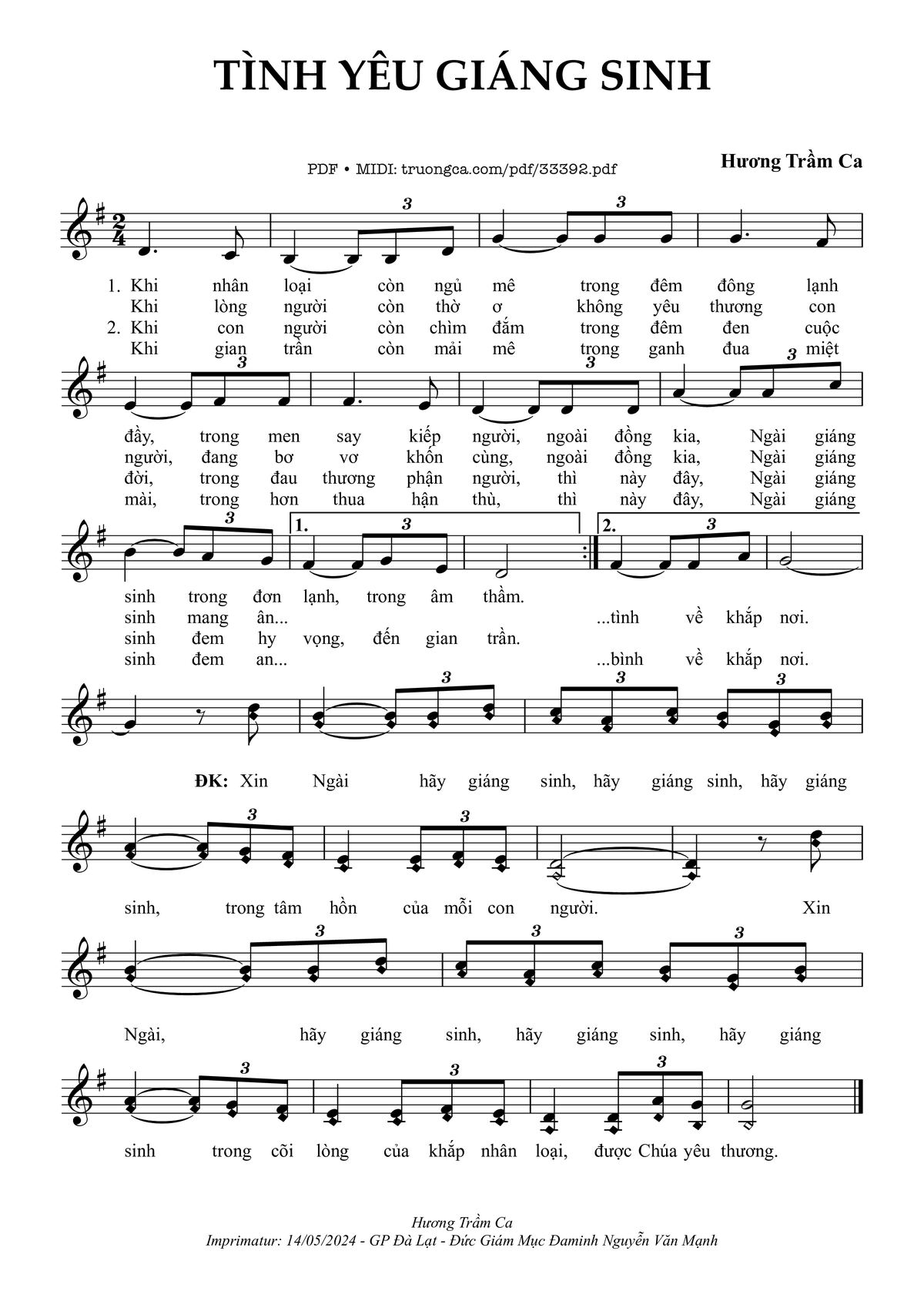 Sheet nhạc có nốt Tình Yêu Giáng Sinh của nhạc sĩ Hương Trầm Ca và file PDF nốt nhạc đăng lên đây nhằm giúp các bạn xướng âm cho đúng nốt và hát thêm hay, chỉ mang tính chất tham khảo, không có mục đích thương mại. Bản quyền thuộc về tác giả và tổ chức nắm bản quyền, Truongca.com không giữ bất kỳ bản quyền của nội dung nào cả. Các bạn có thể tải về bản PDF chất lượng cao, gồm khuông nhạc có nốt với đường link file PDF bên trên.