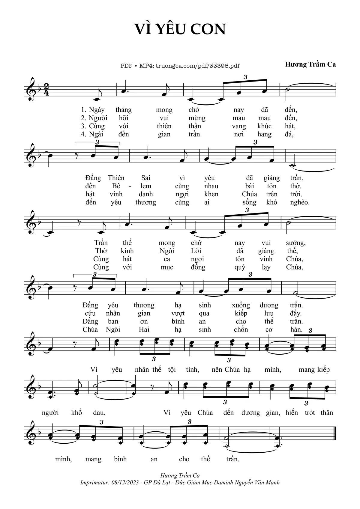 Sheet nhạc có nốt Vì Yêu Con của nhạc sĩ Hương Trầm Ca và file PDF nốt nhạc đăng lên đây nhằm giúp các bạn xướng âm cho đúng nốt và hát thêm hay, chỉ mang tính chất tham khảo, không có mục đích thương mại. Bản quyền thuộc về tác giả và tổ chức nắm bản quyền, Truongca.com không giữ bất kỳ bản quyền của nội dung nào cả. Các bạn có thể tải về bản PDF chất lượng cao, gồm khuông nhạc có nốt với đường link file PDF bên trên.