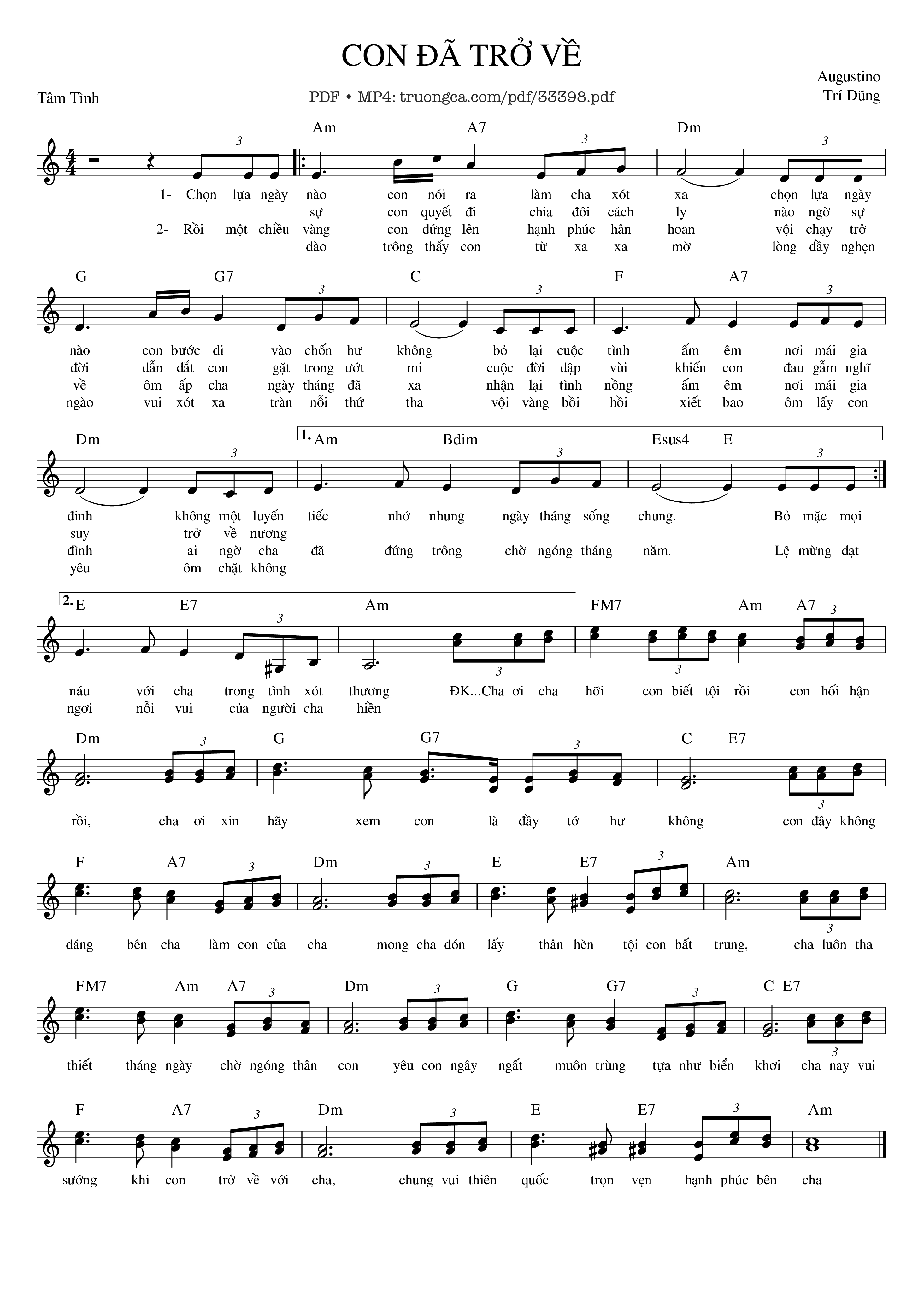 Chọn nút dấu + để tăng tông lên nửa cung, nút dấu - để giảm tông xuống nửa cung. Rê chuột vào hợp âm để xem các thế bấm hợp âm của bài hát Con Đã Trở Về.
