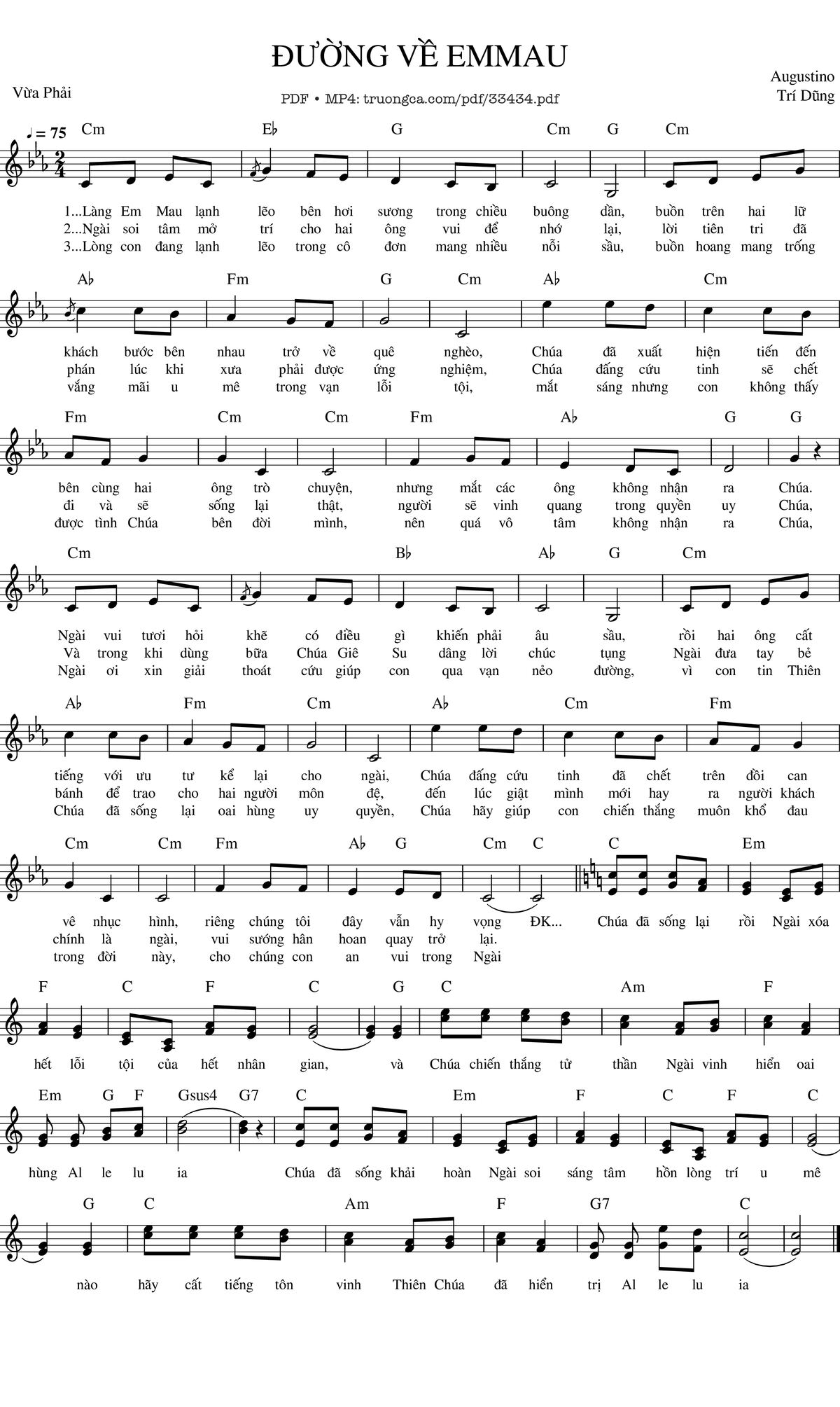 Sheet nhạc có nốt Đường Về Emmau của nhạc sĩ Agustino Trí Dũng và file PDF nốt nhạc đăng lên đây nhằm giúp các bạn xướng âm cho đúng nốt và hát thêm hay, chỉ mang tính chất tham khảo, không có mục đích thương mại. Bản quyền thuộc về tác giả và tổ chức nắm bản quyền, Truongca.com không giữ bất kỳ bản quyền của nội dung nào cả. Các bạn có thể tải về bản PDF chất lượng cao, gồm khuông nhạc có nốt với đường link file PDF bên trên.