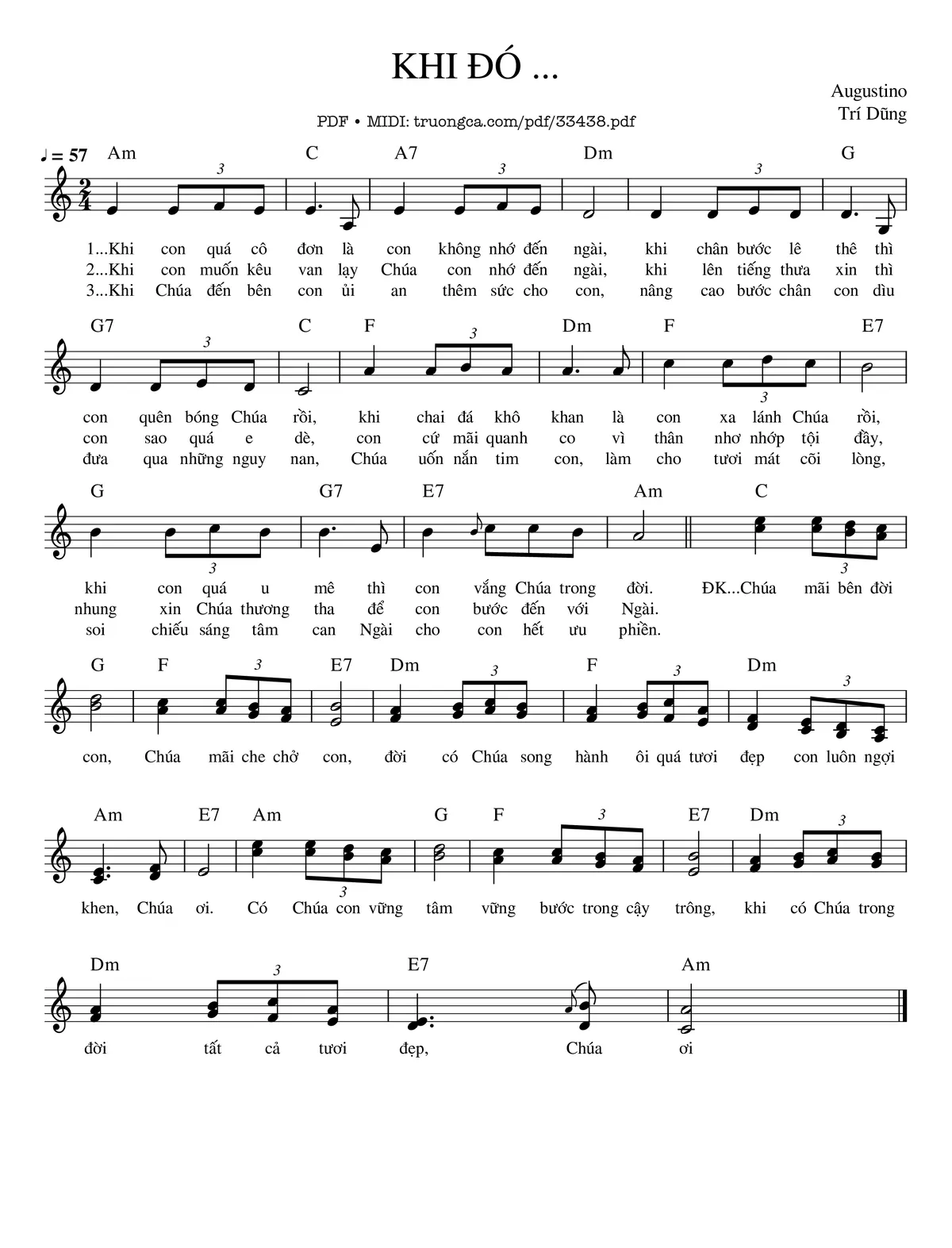 Sheet nhạc có nốt Khi Đó… của nhạc sĩ Agustino Trí Dũng và file PDF nốt nhạc đăng lên đây nhằm giúp các bạn xướng âm cho đúng nốt và hát thêm hay, chỉ mang tính chất tham khảo, không có mục đích thương mại. Bản quyền thuộc về tác giả và tổ chức nắm bản quyền, Truongca.com không giữ bất kỳ bản quyền của nội dung nào cả. Các bạn có thể tải về bản PDF chất lượng cao, gồm khuông nhạc có nốt với đường link file PDF bên trên.
