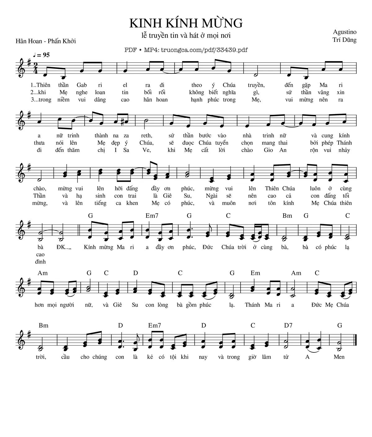 Sheet nhạc có nốt Kinh Kính Mừng của nhạc sĩ Agustino Trí Dũng và file PDF nốt nhạc đăng lên đây nhằm giúp các bạn xướng âm cho đúng nốt và hát thêm hay, chỉ mang tính chất tham khảo, không có mục đích thương mại. Bản quyền thuộc về tác giả và tổ chức nắm bản quyền, Truongca.com không giữ bất kỳ bản quyền của nội dung nào cả. Các bạn có thể tải về bản PDF chất lượng cao, gồm khuông nhạc có nốt với đường link file PDF bên trên.
