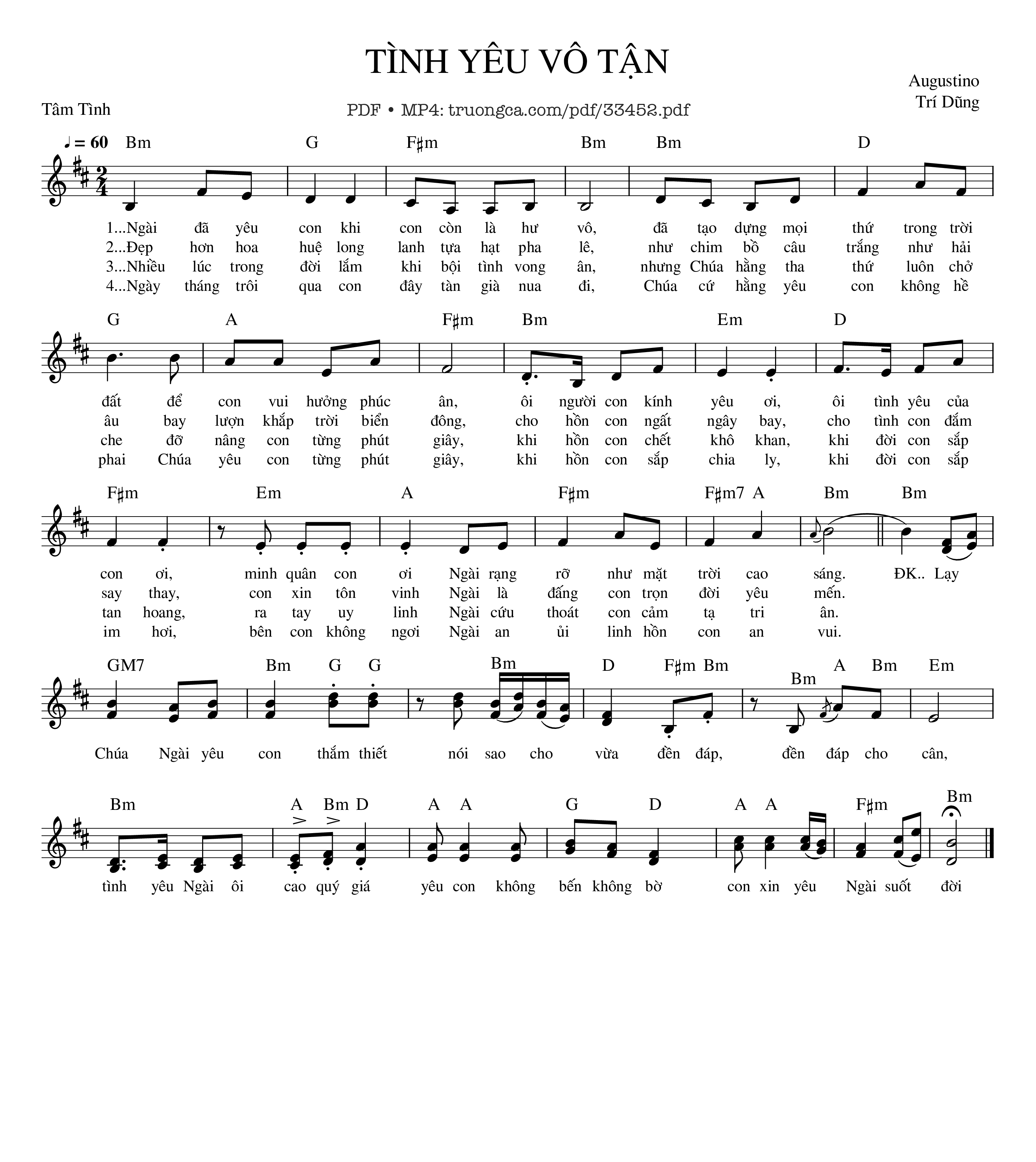 Sheet nhạc có nốt Tình Yêu Vô Tận của nhạc sĩ Agustino Trí Dũng và file PDF nốt nhạc đăng lên đây nhằm giúp các bạn xướng âm cho đúng nốt và hát thêm hay, chỉ mang tính chất tham khảo, không có mục đích thương mại. Bản quyền thuộc về tác giả và tổ chức nắm bản quyền, Truongca.com không giữ bất kỳ bản quyền của nội dung nào cả. Các bạn có thể tải về bản PDF chất lượng cao, gồm khuông nhạc có nốt với đường link file PDF bên trên.