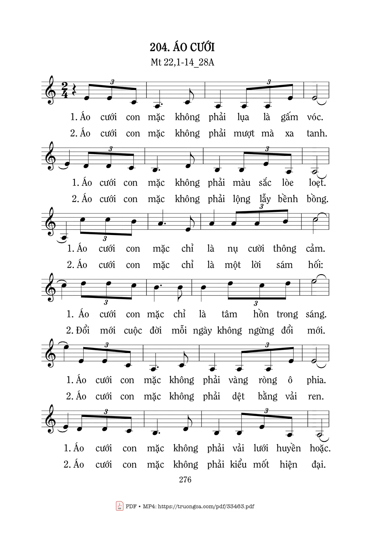 Sheet nhạc có nốt Áo Cưới của nhạc sĩ Mi Trầm và file PDF nốt nhạc đăng lên đây nhằm giúp các bạn xướng âm cho đúng nốt và hát thêm hay, chỉ mang tính chất tham khảo, không có mục đích thương mại. Bản quyền thuộc về tác giả và tổ chức nắm bản quyền, Truongca.com không giữ bất kỳ bản quyền của nội dung nào cả. Các bạn có thể tải về bản PDF chất lượng cao, gồm khuông nhạc có nốt với đường link file PDF bên trên.