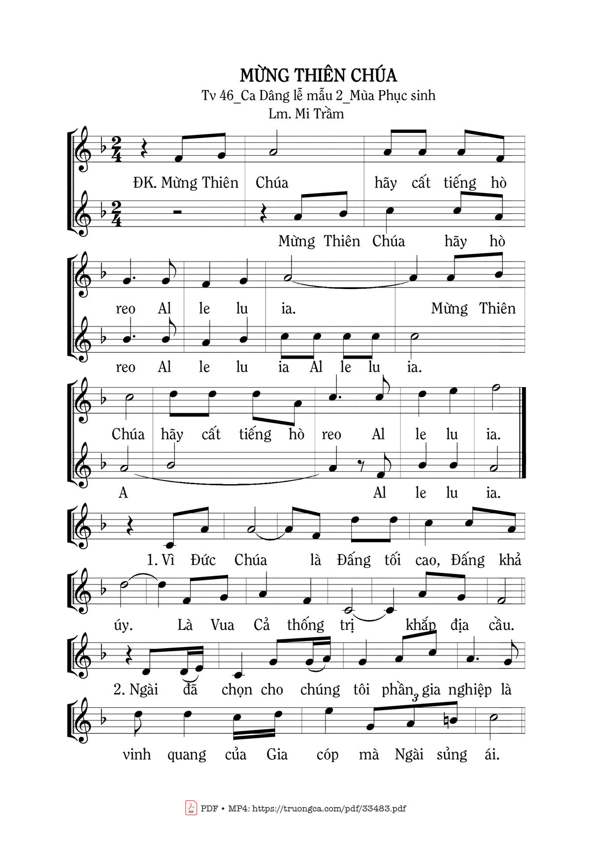 Sheet nhạc có nốt Mừng Thiên Chúa của nhạc sĩ Mi Trầm và file PDF nốt nhạc đăng lên đây nhằm giúp các bạn xướng âm cho đúng nốt và hát thêm hay, chỉ mang tính chất tham khảo, không có mục đích thương mại. Bản quyền thuộc về tác giả và tổ chức nắm bản quyền, Truongca.com không giữ bất kỳ bản quyền của nội dung nào cả. Các bạn có thể tải về bản PDF chất lượng cao, gồm khuông nhạc có nốt với đường link file PDF bên trên.
