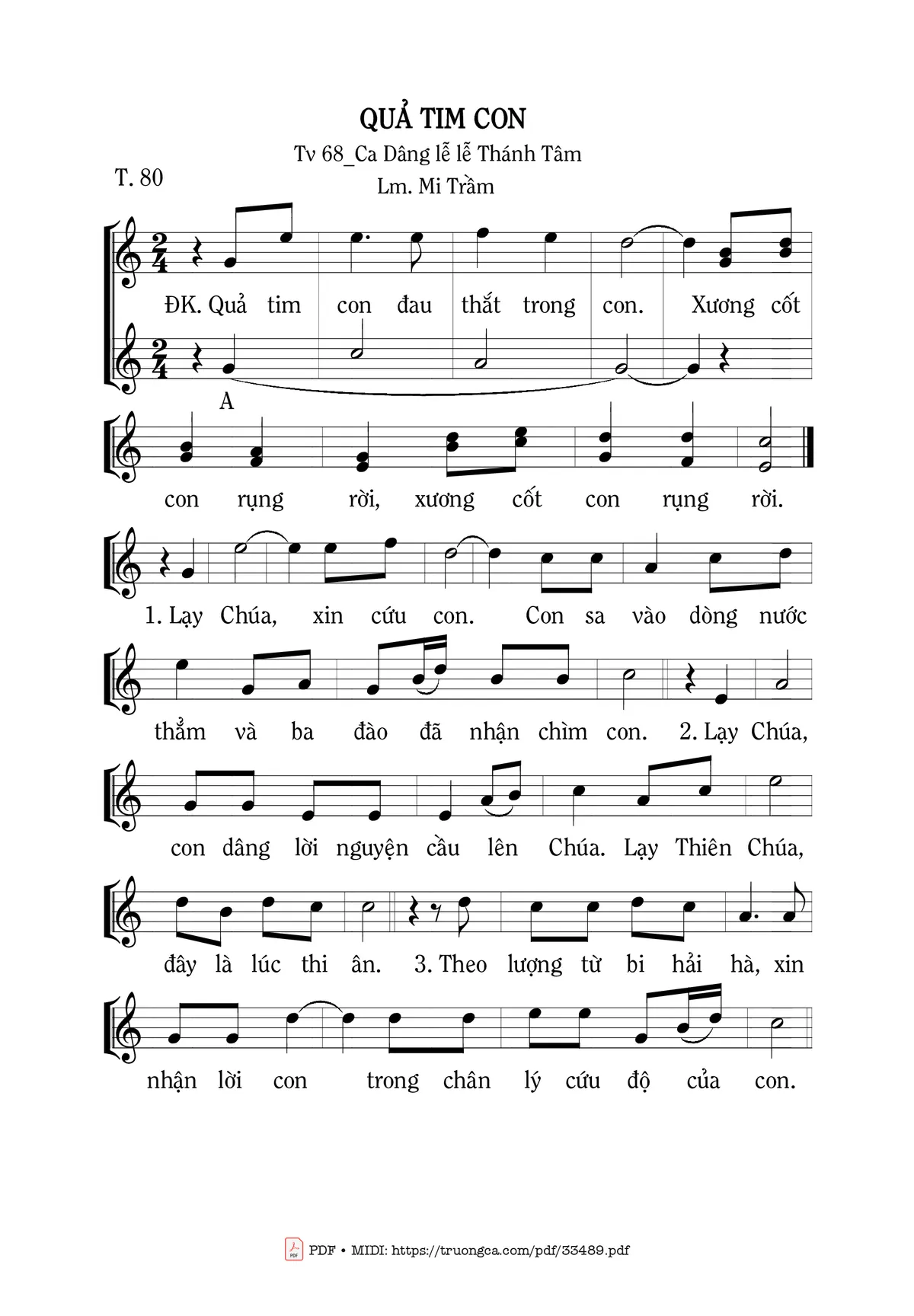Sheet nhạc có nốt Quả Tim Con của nhạc sĩ Mi Trầm và file PDF nốt nhạc đăng lên đây nhằm giúp các bạn xướng âm cho đúng nốt và hát thêm hay, chỉ mang tính chất tham khảo, không có mục đích thương mại. Bản quyền thuộc về tác giả và tổ chức nắm bản quyền, Truongca.com không giữ bất kỳ bản quyền của nội dung nào cả. Các bạn có thể tải về bản PDF chất lượng cao, gồm khuông nhạc có nốt với đường link file PDF bên trên.