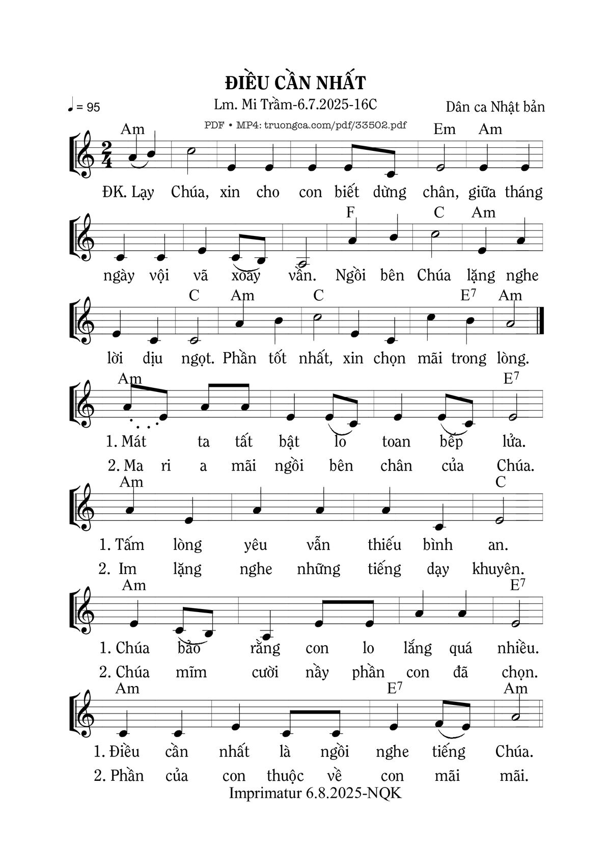 Sheet nhạc có nốt Điều Cần Nhất của nhạc sĩ Mi Trầm và file PDF nốt nhạc đăng lên đây nhằm giúp các bạn xướng âm cho đúng nốt và hát thêm hay, chỉ mang tính chất tham khảo, không có mục đích thương mại. Bản quyền thuộc về tác giả và tổ chức nắm bản quyền, Truongca.com không giữ bất kỳ bản quyền của nội dung nào cả. Các bạn có thể tải về bản PDF chất lượng cao, gồm khuông nhạc có nốt với đường link file PDF bên trên.