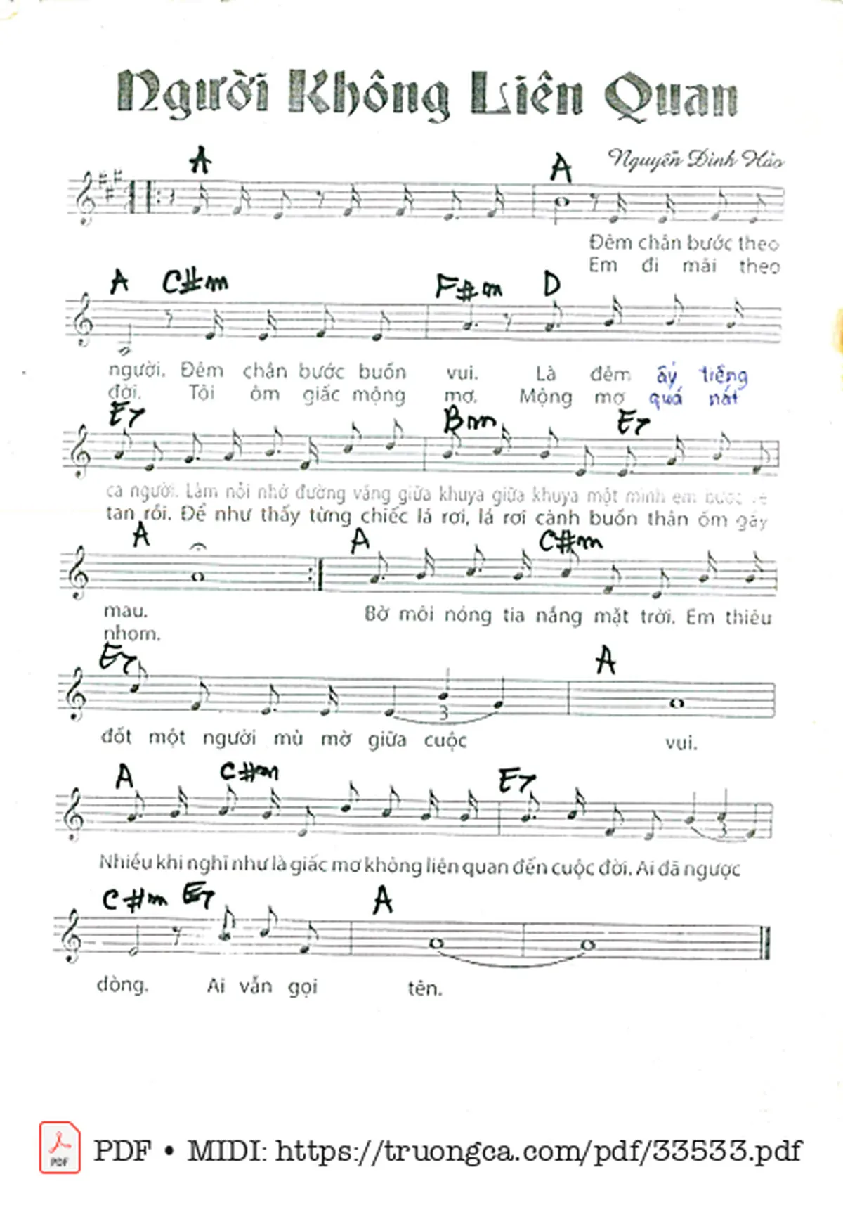 Nguyễn Đình Hảo Đêm chân bứơc theo người đêm chân bứơc buồn vui [PDF] [Sheet] [Lời H.A] [Mp4/Midi]