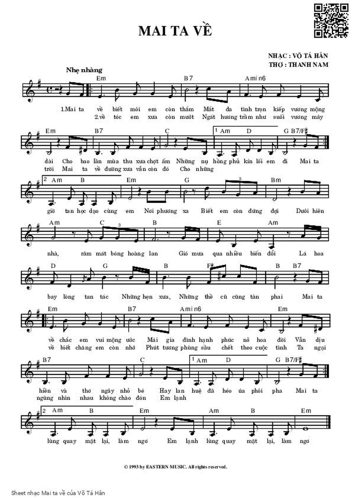Võ Tá Hân Mai ta về biết môi em còn thắm Mắt đa tình trọn kiếp vương mộng dài [PDF] [Sheet] [Lời H.A] [Mp4/Midi]