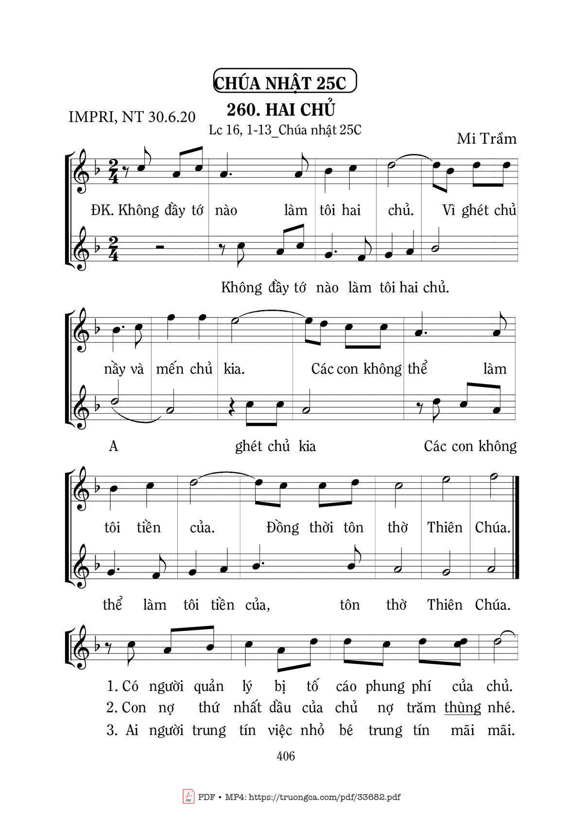 Mi Trầm Không đầy tớ nào làm tôi hai chủ Vì ghét chủ nầy và mến chủ kia [PDF] [Sheet] [Lời H.A] [Mp4/Midi]