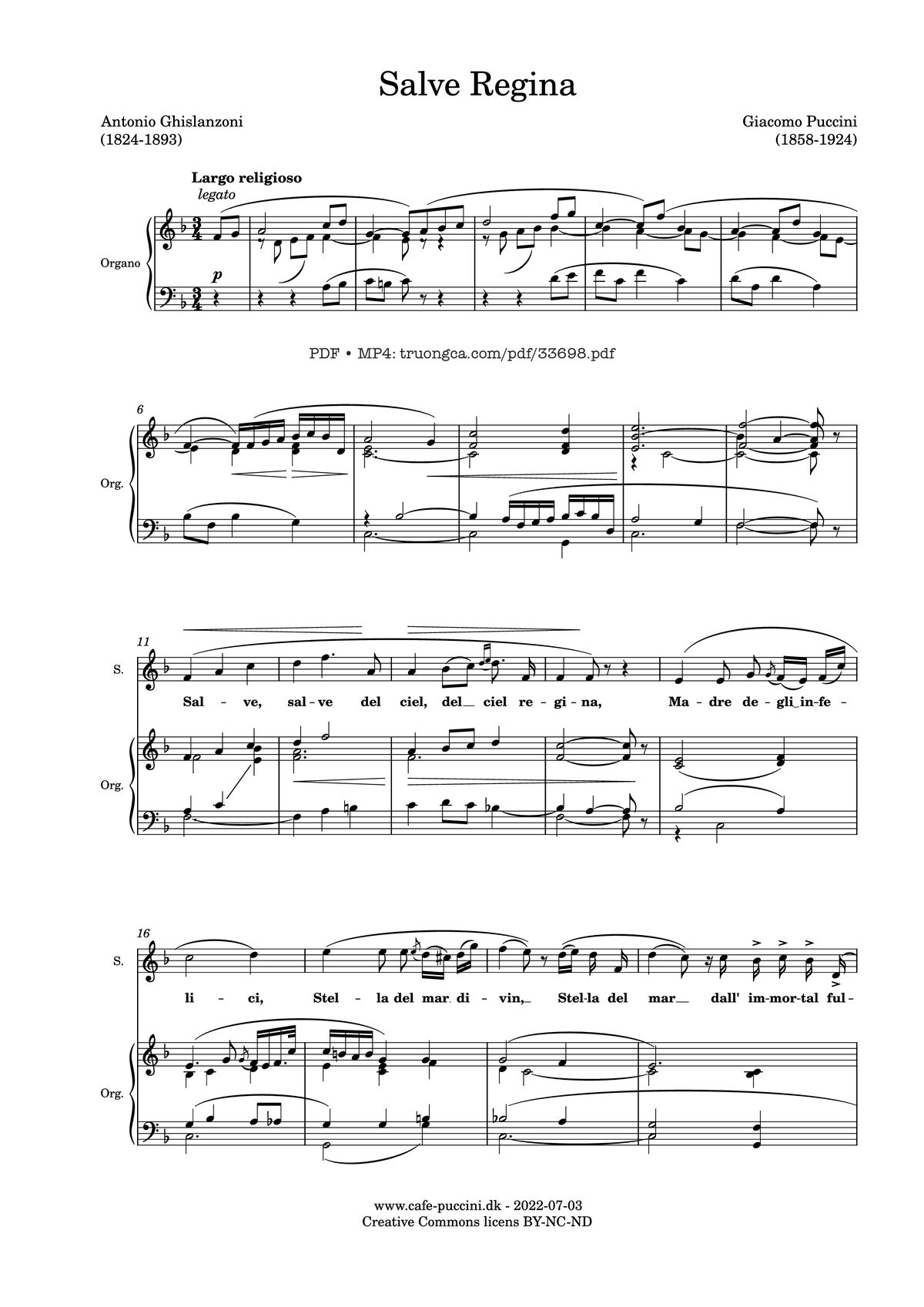 Phần nghe hát Salve Regina (Giacomo Puccini) được nhúng từ Youtube, Musescore hoặc link ngoài và chịu sự kiểm soát bản quyền của bên thứ ba đó, vì vậy có thể bị xóa hoặc chèn quảng cáo bất kỳ lúc nào. Nếu bạn không nghe - xem được ca sĩ hát tức là đã bị Youtube hoặc Musescore kiểm soát.