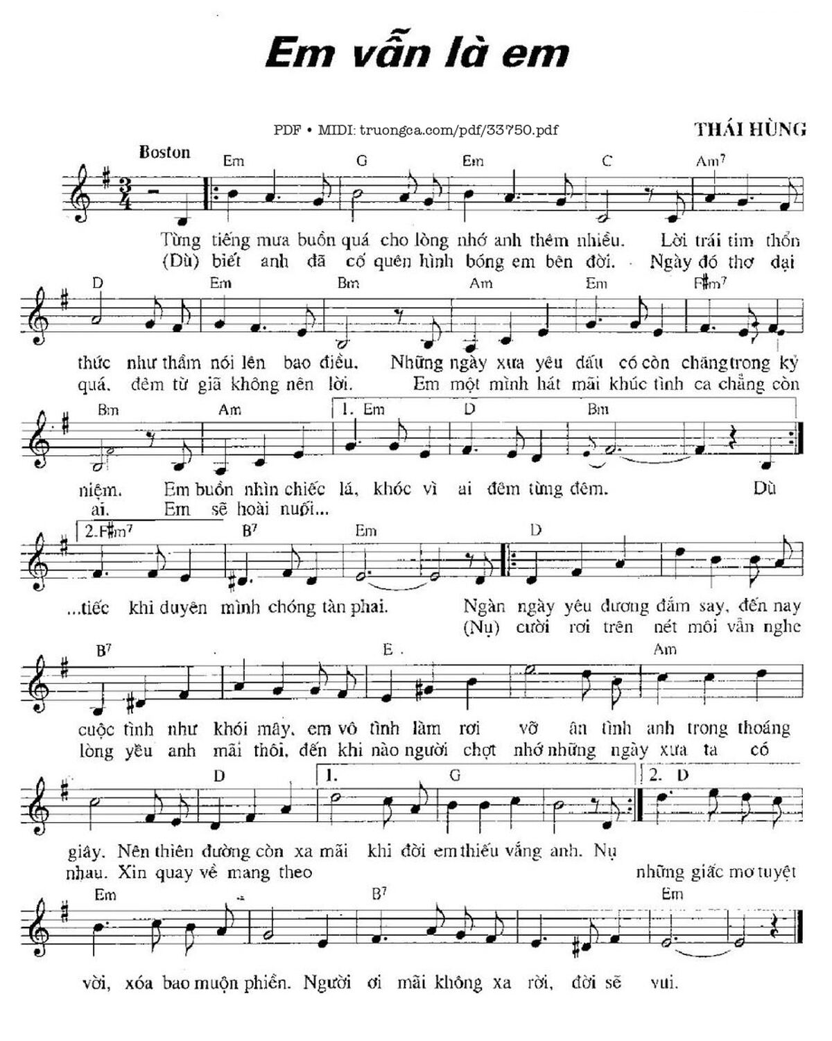 Sheet nhạc có nốt Em Vẫn Là Em của nhạc sĩ Thái Hùng và file PDF nốt nhạc đăng lên đây nhằm giúp các bạn xướng âm cho đúng nốt và hát thêm hay, chỉ mang tính chất tham khảo, không có mục đích thương mại. Bản quyền thuộc về tác giả và tổ chức nắm bản quyền, Truongca.com không giữ bất kỳ bản quyền của nội dung nào cả. Các bạn có thể tải về bản PDF chất lượng cao, gồm khuông nhạc có nốt với đường link file PDF bên trên.