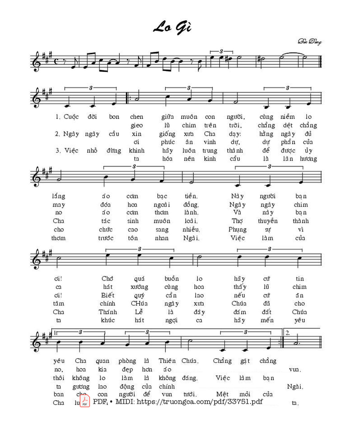 Sheet nhạc có nốt Lo Gì của nhạc sĩ Nguyễn Đức Dũng và file PDF nốt nhạc đăng lên đây nhằm giúp các bạn xướng âm cho đúng nốt và hát thêm hay, chỉ mang tính chất tham khảo, không có mục đích thương mại. Bản quyền thuộc về tác giả và tổ chức nắm bản quyền, Truongca.com không giữ bất kỳ bản quyền của nội dung nào cả. Các bạn có thể tải về bản PDF chất lượng cao, gồm khuông nhạc có nốt với đường link file PDF bên trên.