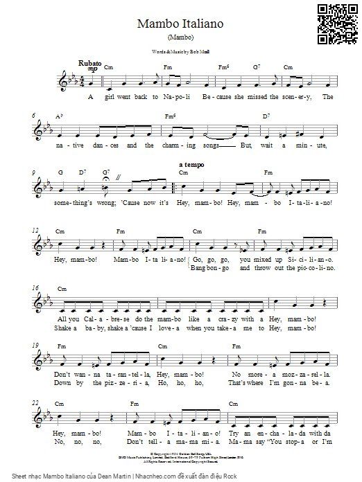Phần nghe hát Mambo Italiano (Dean Martin) được nhúng từ Youtube, Musescore hoặc link ngoài và chịu sự kiểm soát bản quyền của bên thứ ba đó, vì vậy có thể bị xóa hoặc chèn quảng cáo bất kỳ lúc nào. Nếu bạn không nghe - xem được ca sĩ hát tức là đã bị Youtube hoặc Musescore kiểm soát.