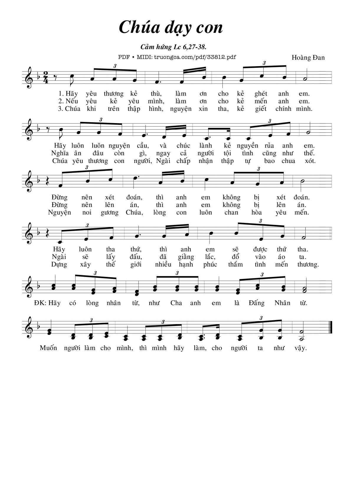 Chọn nút dấu + để tăng tông lên nửa cung, nút dấu - để giảm tông xuống nửa cung. Rê chuột vào hợp âm để xem các thế bấm hợp âm của bài hát Chúa Dạy Con.