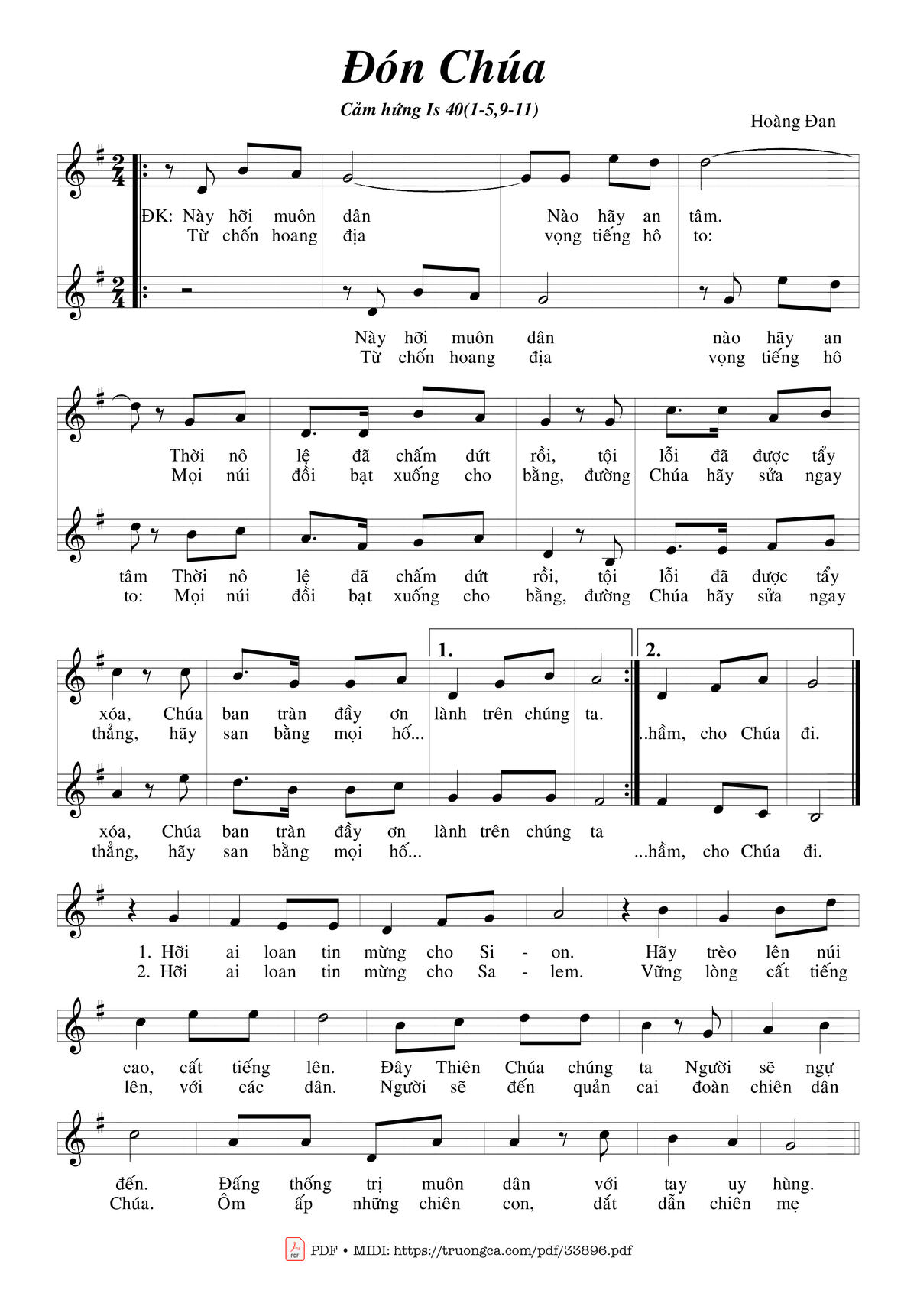 2. Hỡi ai loan tin mừng cho Si-on. Vững lòng cất tiếng lên với các dân. Người sẽ đến quản cai đoàn chiên dân Chúa. Ôm ấp những chiên con, dắt dẫn chiên mẹ
