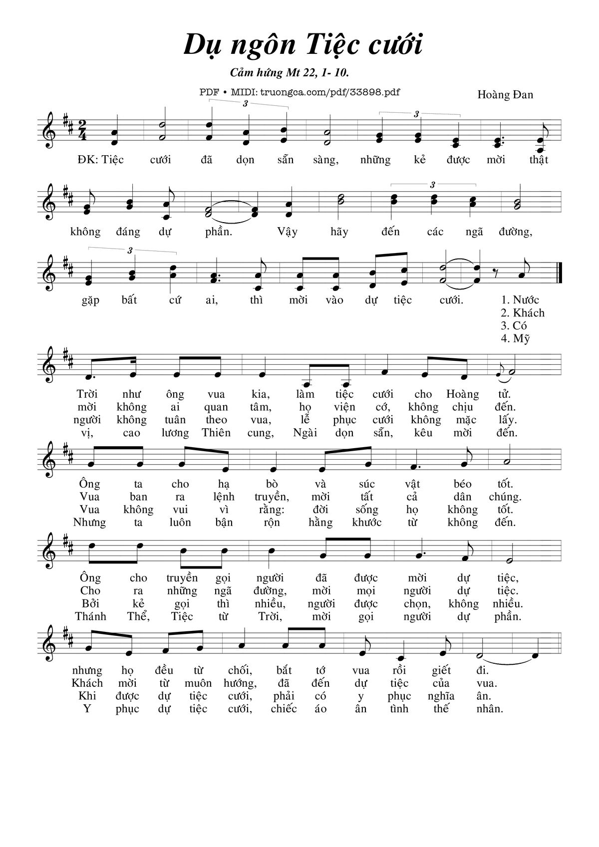 Điệp khúc: Tiệc cưới đã dọn sẵn sàng, những kẻ được mời thật không đáng dự phần. Vậy hãy đến các ngã đường, gặp bất cứ ai, thì mời vào dự tiệc cưới.
