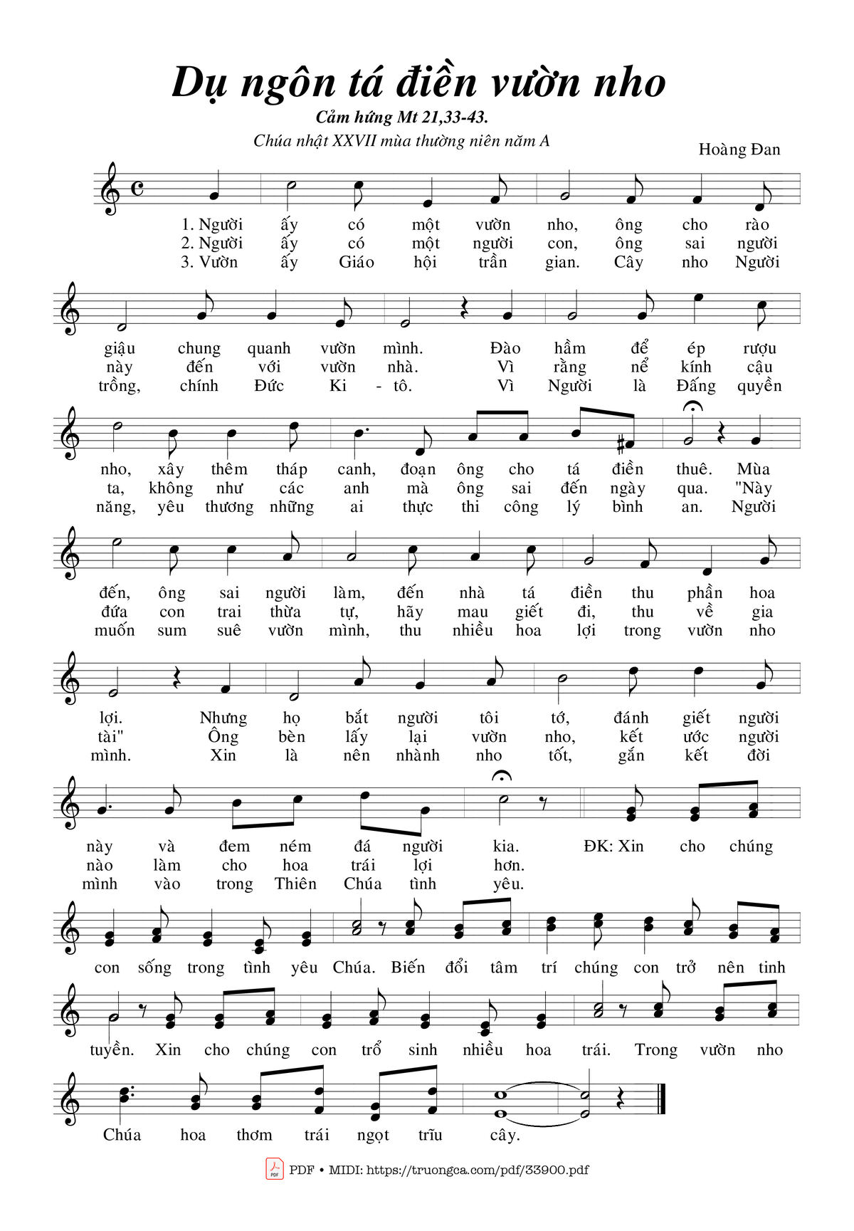 3. Vườn ấy Giáo hội trần gian. Cây nho Người trồng: chính Đức Ki-tô. Vì Người là Đấng quyền năng, yêu thương những ai thực thi công lý bình an. Người muốn sum suê vườn mình, thu nhiều hoa lợi trong vườn nho mình. Xin là nên nhành nho tốt, gắn kết đời mình vào trong Thiên Chúa tình yêu.