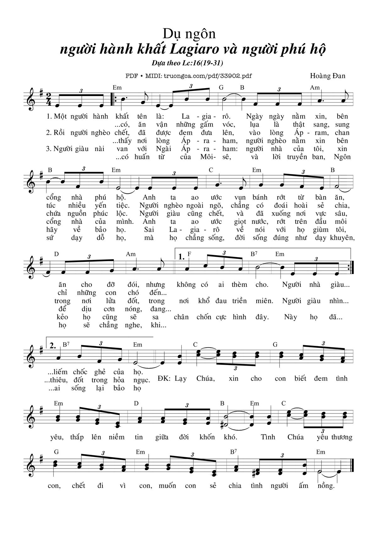 Chọn nút dấu + để tăng tông lên nửa cung, nút dấu - để giảm tông xuống nửa cung. Rê chuột vào hợp âm để xem các thế bấm hợp âm của bài hát Dụ Ngôn Người Hành Khất La-Za-Ro Và Người Phú Hộ.
