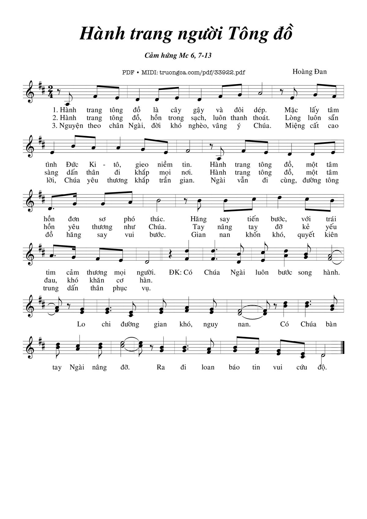 1. Hành trang Tông Đồ là cây gậy và đôi dép. Mặc lấy tâm tình Đức Ki-tô gieo niềm tin. Hành trang Tông Đồ, một tâm tư đơn sơ phó thác. Hăng say tiến bước, với trái tim cảm thương mọi người.