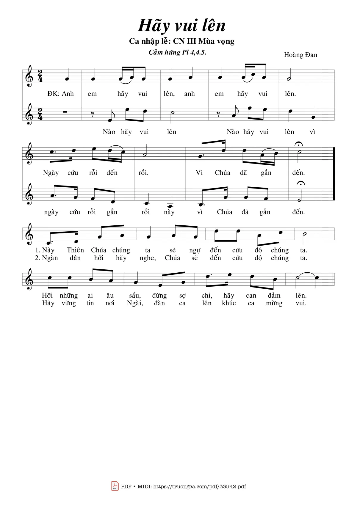 Điệp khúc : Anh em hãy vui lên, anh em hãy vui lên. Ngày cứu rỗi đến rồi, vì Chúa đã gần đến.