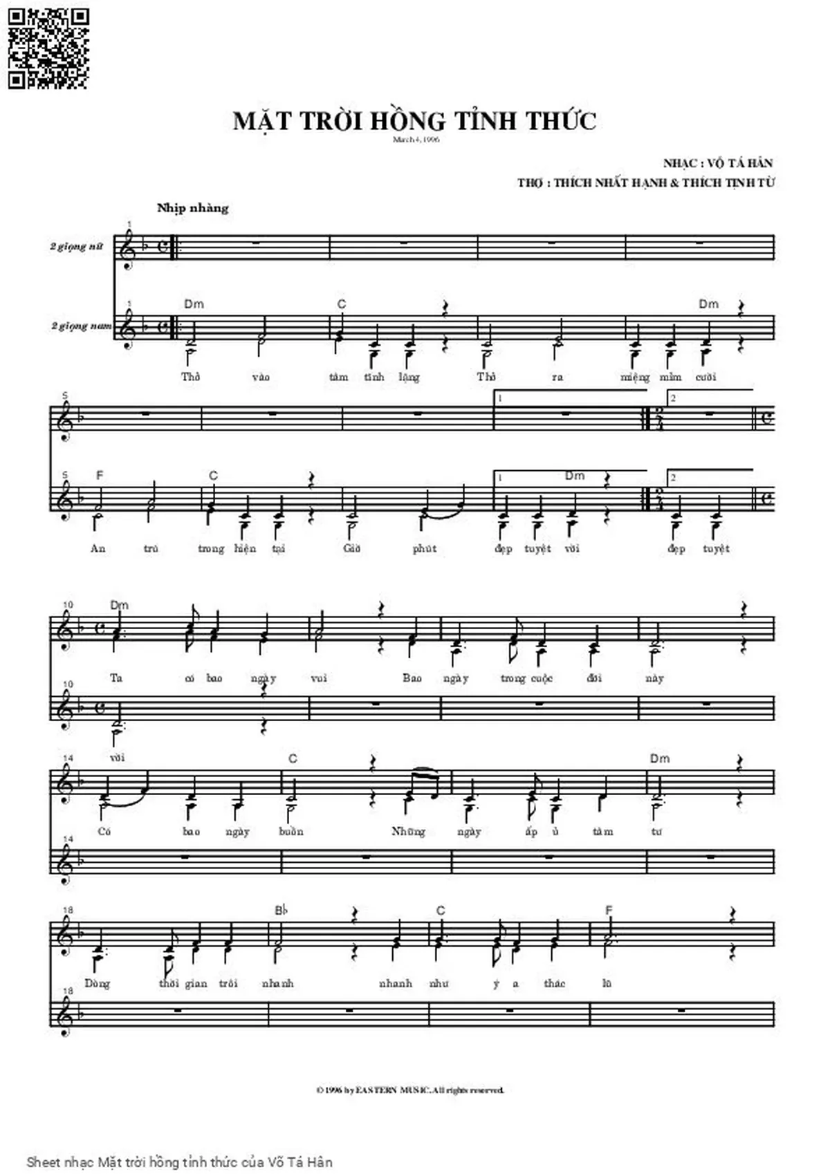 Võ Tá Hân Thở vào tâm tĩnh lặng Thở ra miệng mỉm cười [PDF] [Sheet] [Lời H.A] [Mp4/Midi]
