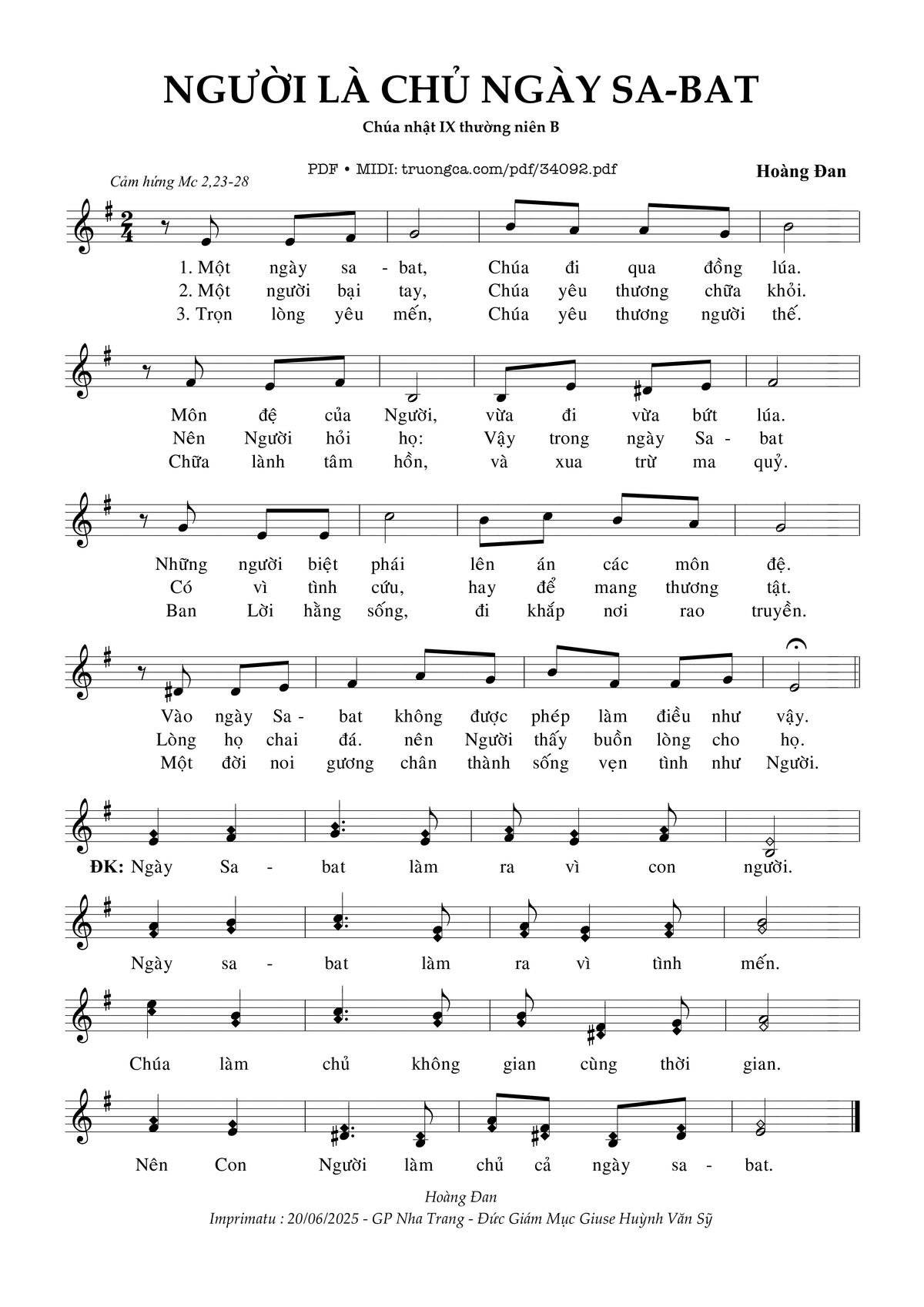Điệp khúc: Ngày Sa-bat, làm ra vì con người. Ngày Sa-bat làm ra vì tình mến. Chúa làm chủ không gian cùng thời gian. Nên Con Người làm chủ cả ngày Sa-bat