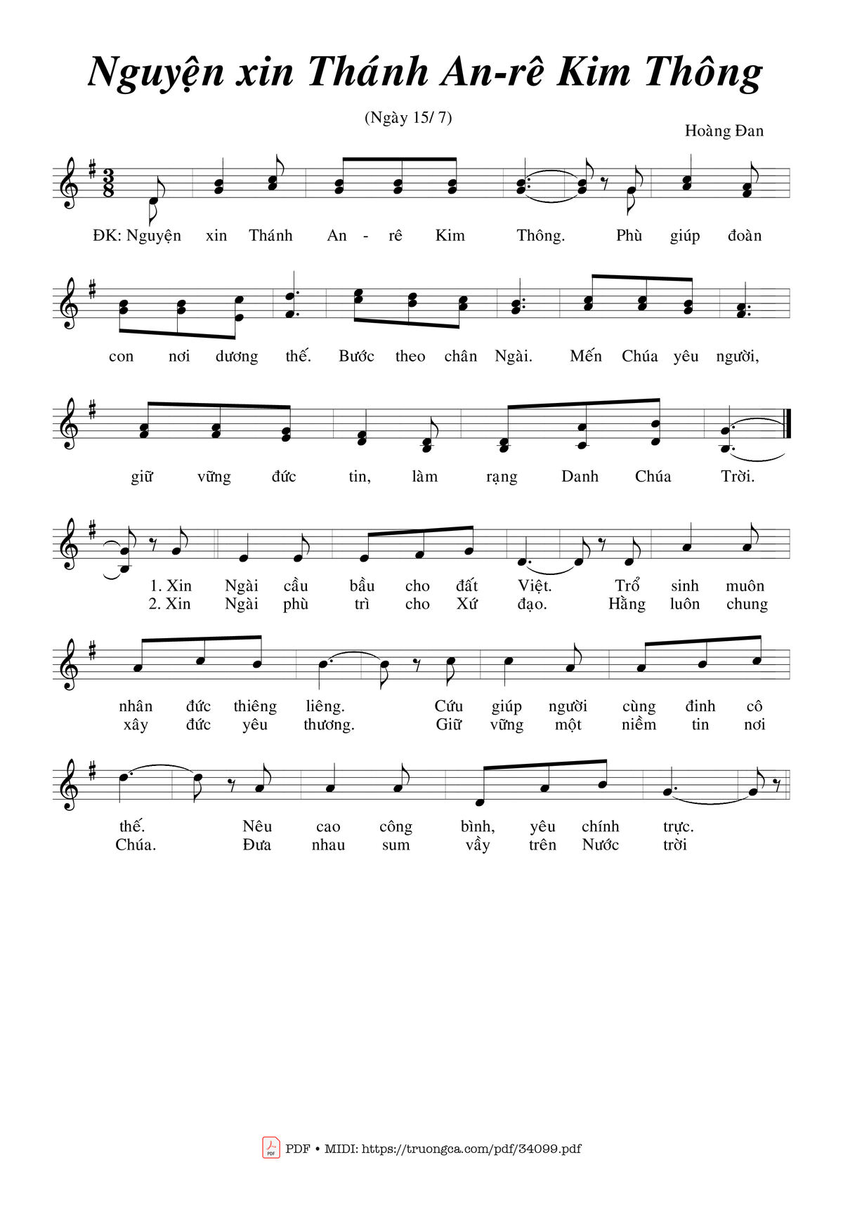 Điệp khúc: Nguyện xin Thánh An-rê Kim Thông. Phù giúp đoàn con nơi dương thế. Bước theo chân Ngài, mến Chúa yêu người, giữ vững đức tin, làm rạng Danh Chúa Trời.