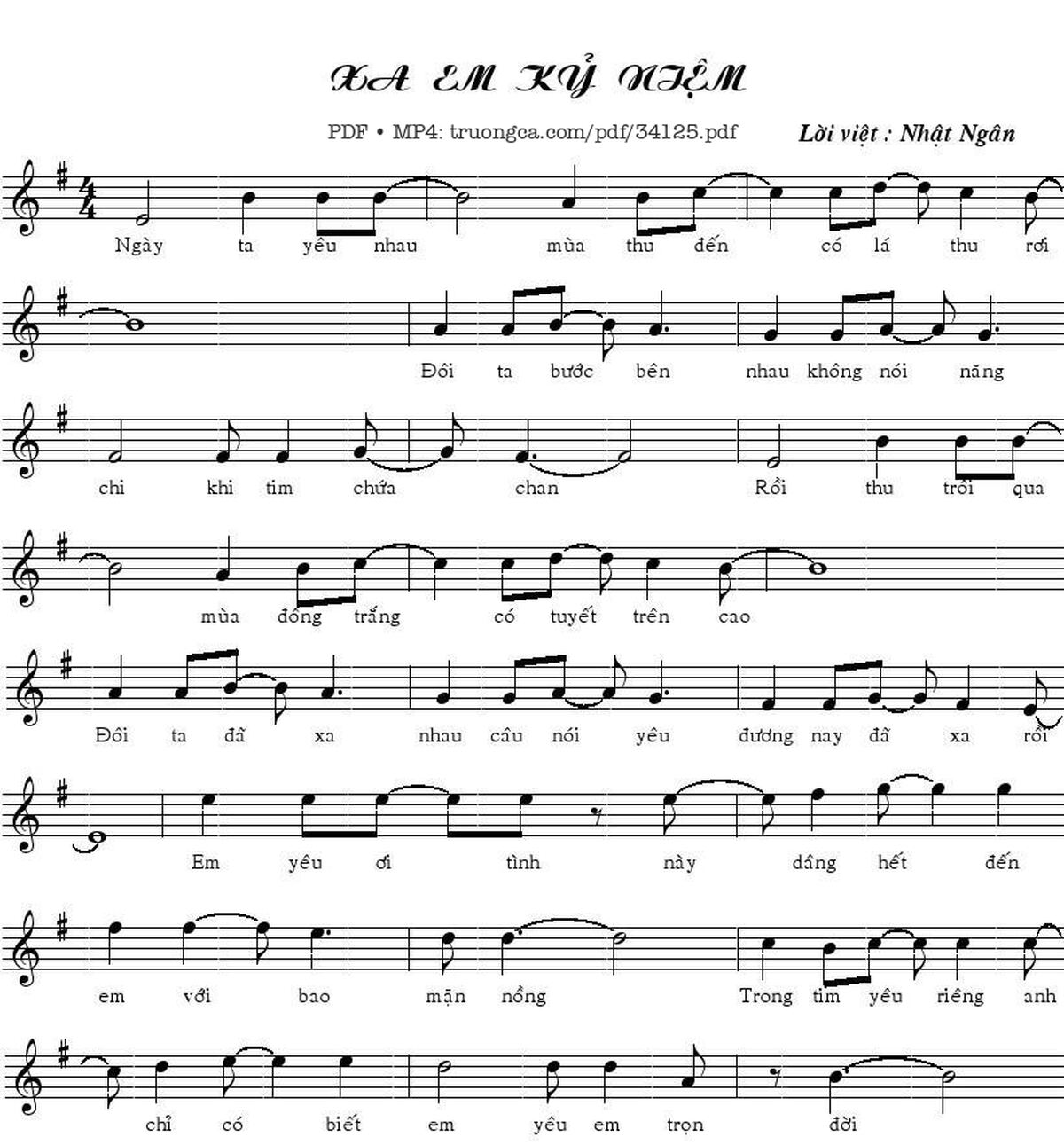 Sheet nhạc có nốt Xa Em Kỷ Niệm của nhạc sĩ Nhật Ngân và file PDF nốt nhạc đăng lên đây nhằm giúp các bạn xướng âm cho đúng nốt và hát thêm hay, chỉ mang tính chất tham khảo, không có mục đích thương mại. Bản quyền thuộc về tác giả và tổ chức nắm bản quyền, Truongca.com không giữ bất kỳ bản quyền của nội dung nào cả. Các bạn có thể tải về bản PDF chất lượng cao, gồm khuông nhạc có nốt với đường link file PDF bên trên.