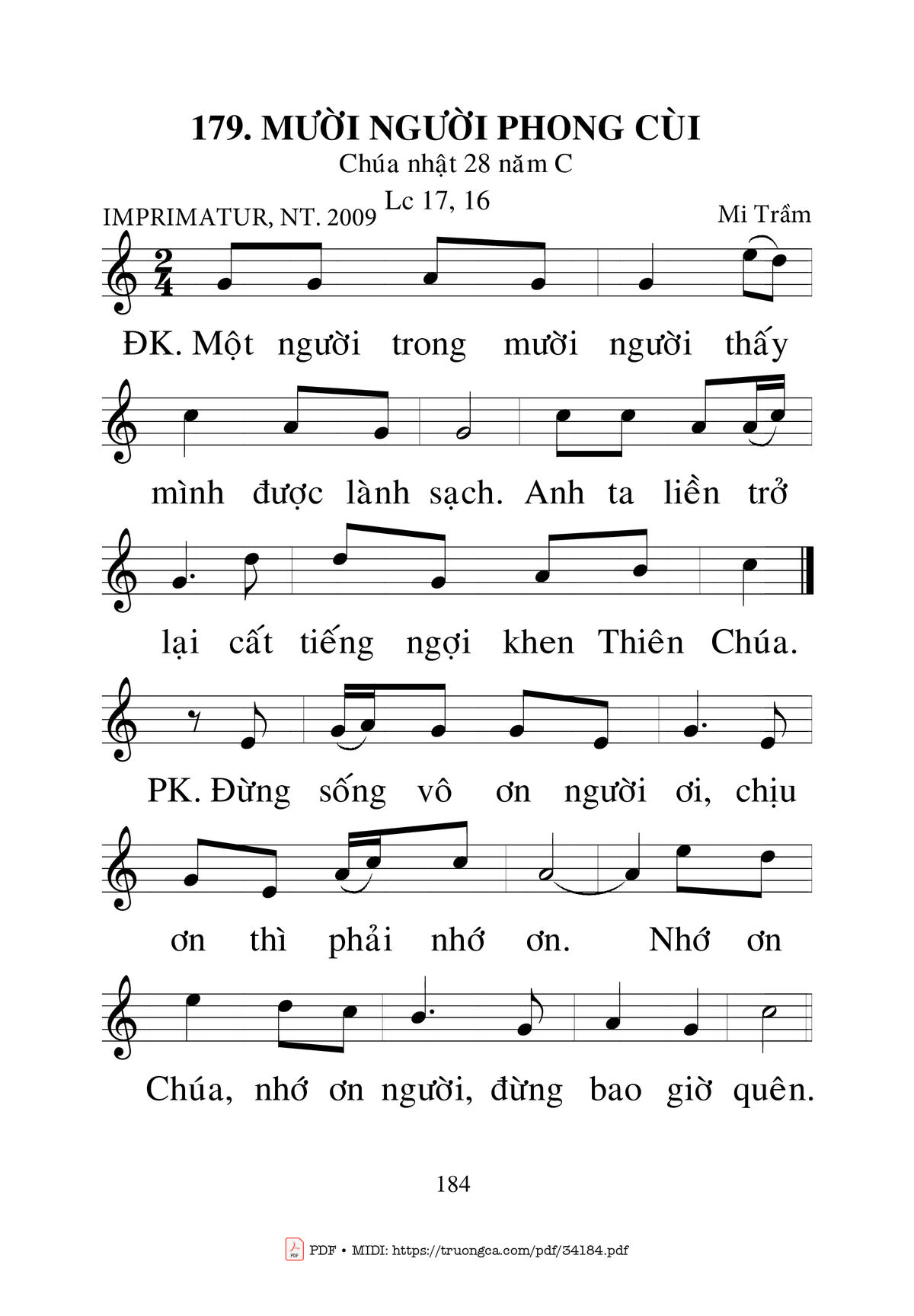Mi Trầm Một người trong mười người thấy mình được lành sạch [PDF] [Sheet] [Lời H.A] [Mp4/Midi]