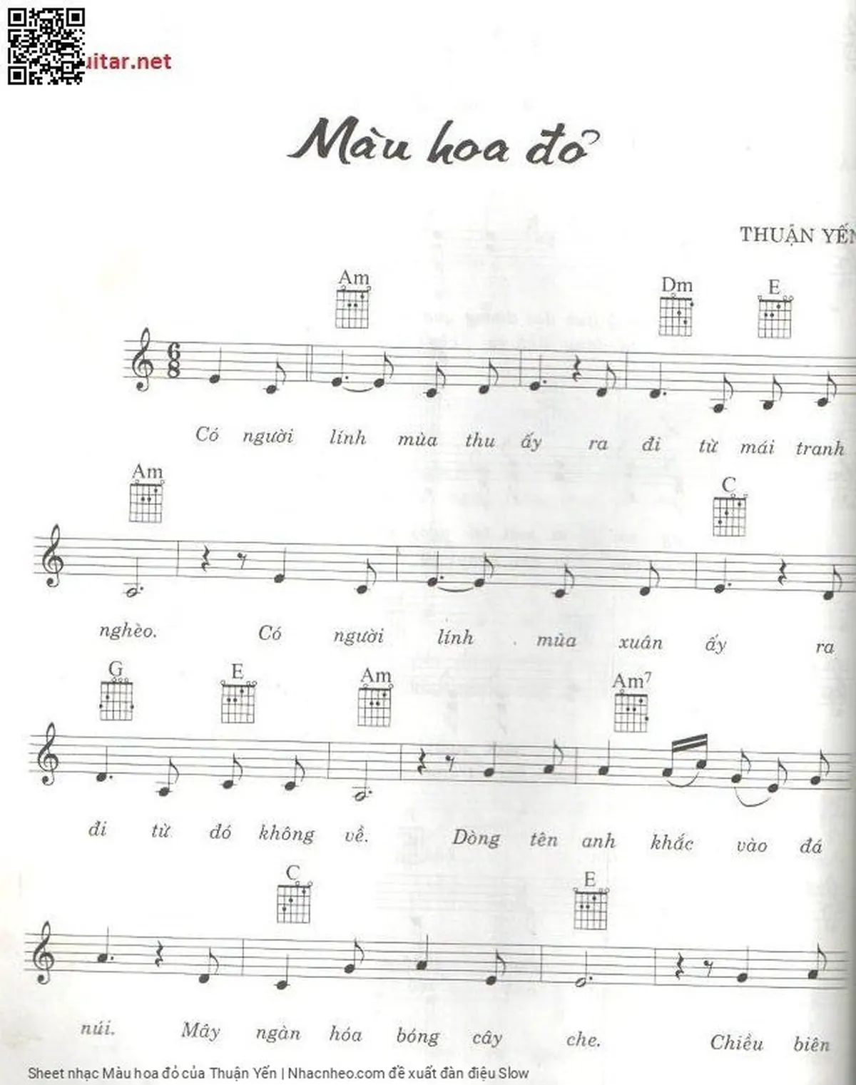 Chọn nút dấu + để tăng tông lên nửa cung, nút dấu - để giảm tông xuống nửa cung. Rê chuột vào hợp âm để xem các thế bấm hợp âm của bài hát Màu hoa đỏ.