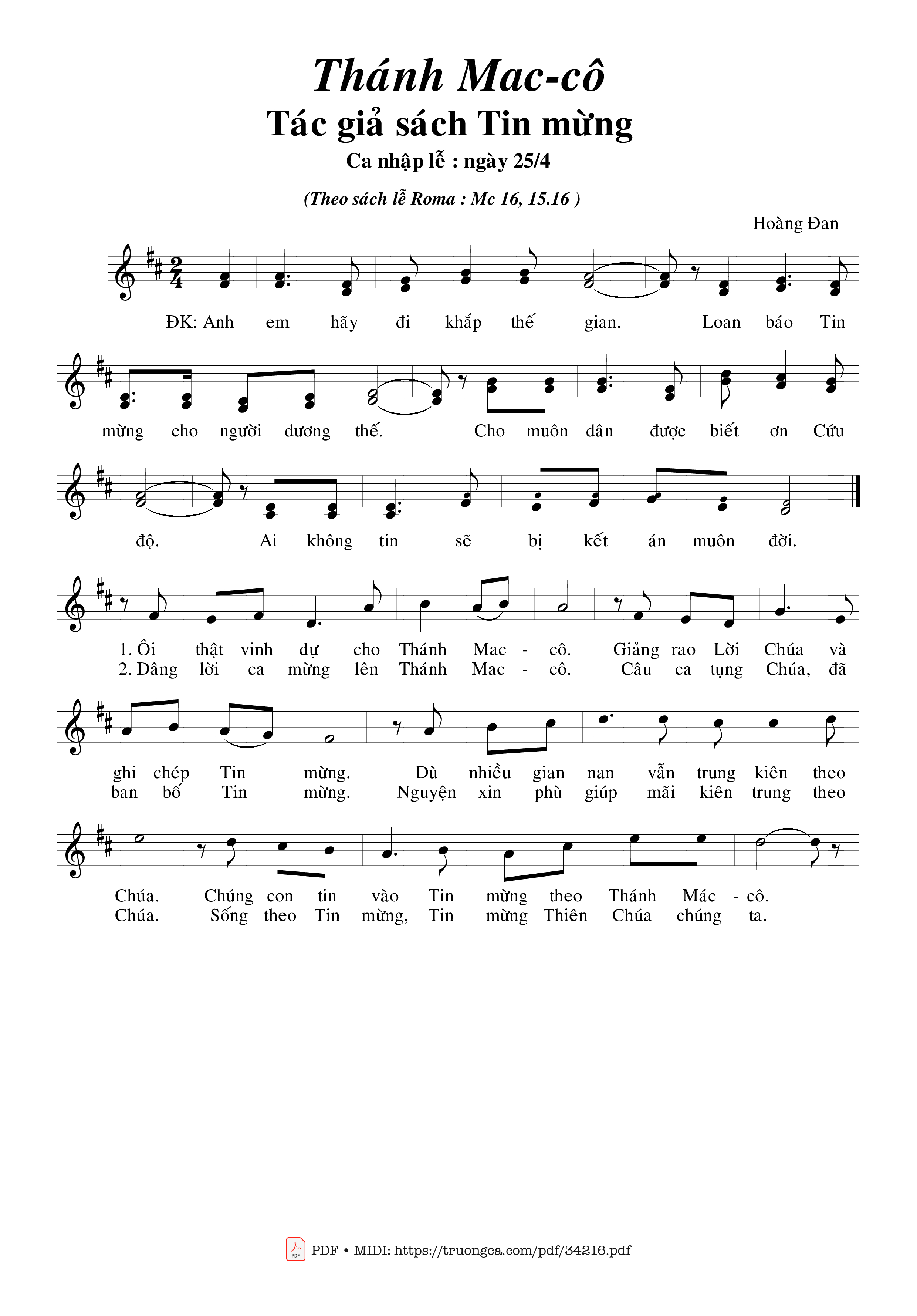 2. Dâng lười ca mừng lên Thánh Mac-cô. Câu ca tụng Chúa đã ban bố Tin mừng. Nguyện xin phù giúp mãi kiên trung theo Chúa. Sống theo Tin mừng. Tin mừng Thiên Chúa chúng ta.
