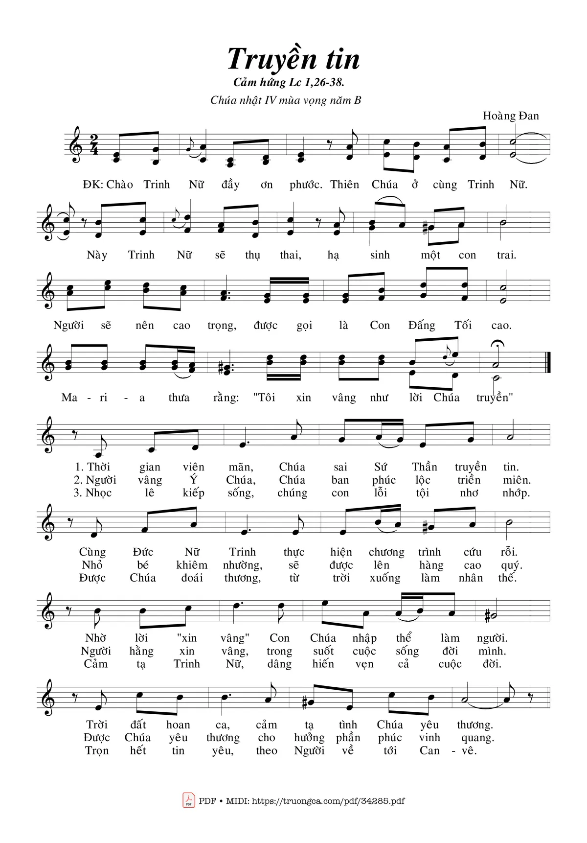 Điệp khúc: Chào Trinh Nữ đầy ơn phước, Thiên Chúa ở cùng Trinh Nữ. Nầy Trinh Nữ