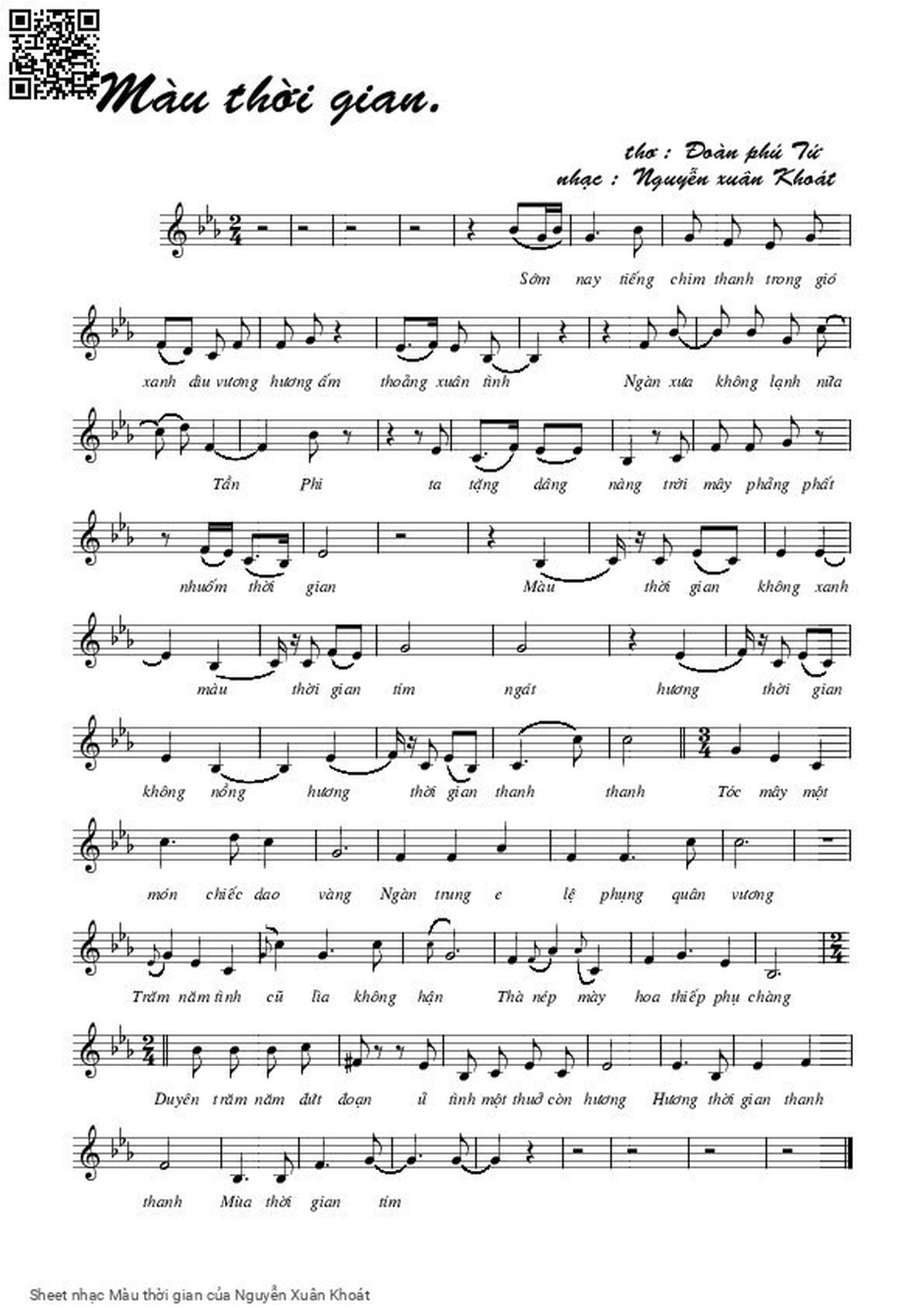 Phần nghe hát Màu thời gian (Nguyễn Xuân Khoát) được nhúng từ Youtube, Musescore hoặc link ngoài và chịu sự kiểm soát bản quyền của bên thứ ba đó, vì vậy có thể bị xóa hoặc chèn quảng cáo bất kỳ lúc nào. Nếu bạn không nghe - xem được ca sĩ hát tức là đã bị Youtube hoặc Musescore kiểm soát.