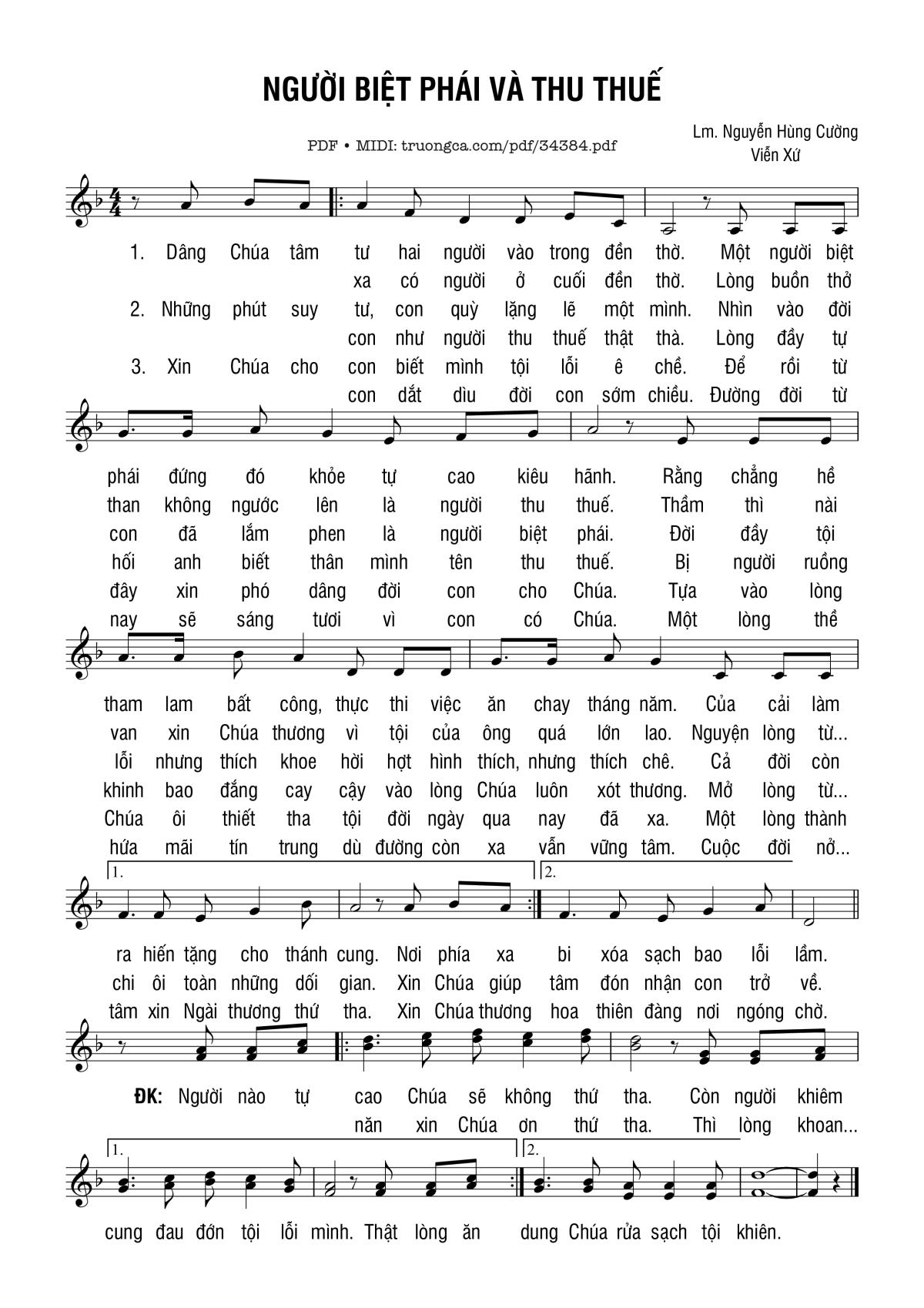 1. Dâng Chúa tâm tư hai người vào trong đền thờ. Một người biệt phái đứng đó khỏe tự cao kiêu hãnh. Rằng chẳng hề tham lam bất công, thực thi việc ăn chay tháng năm. Của cải làm ra hiến tặng cho thánh cung. Nơi phía xa xa có người ở cuối đền thờ. Lòng buồn thở than không ngước lên là người thu thuế. Thầm thì nài van xin Chúa thương vì tội của ông quá lớn lao. Nguyện lòng từ bi xóa sạch bao lỗi lầm.