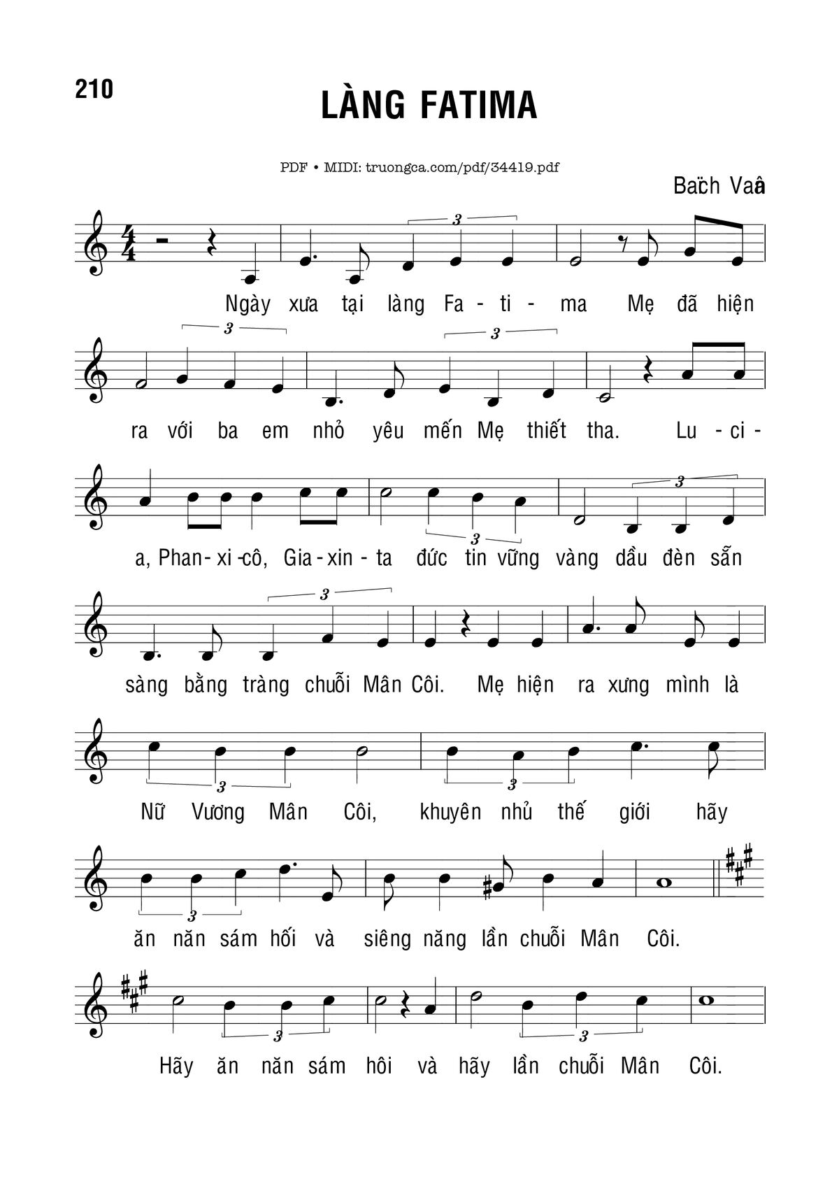 Chọn nút dấu + để tăng tông lên nửa cung, nút dấu - để giảm tông xuống nửa cung. Rê chuột vào hợp âm để xem các thế bấm hợp âm của bài hát Làng Fatima.