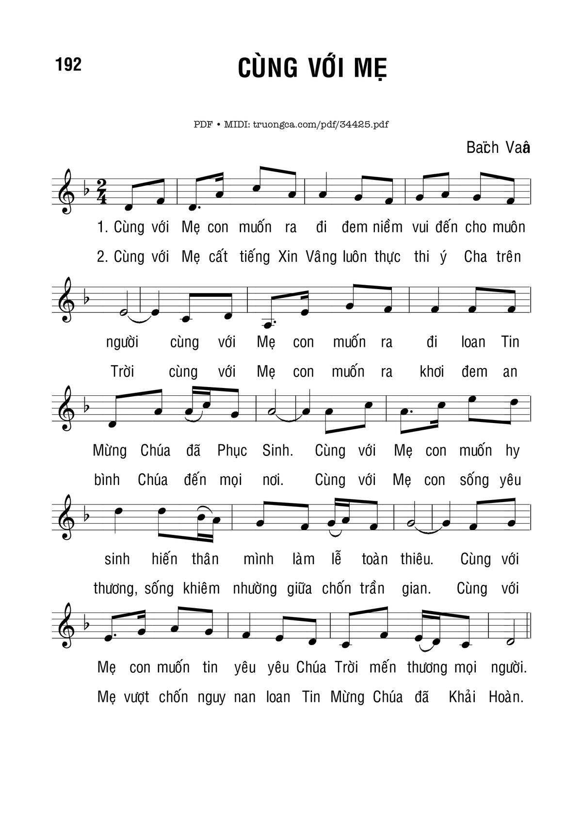 1. Cùng với Mẹ con muốn ra đi đem niềm vui đến cho muôn người. Cùng với Mẹ con muốn ra đi loan Tin Mừng Chúa đã phục sinh. Cùng với Mẹ con muốn hy sinh hiến thân mình làm lễ toàn thiêu. Cùng với Mẹ con muốn tin yêu, yêu Chúa Trời mến thương mọi người.