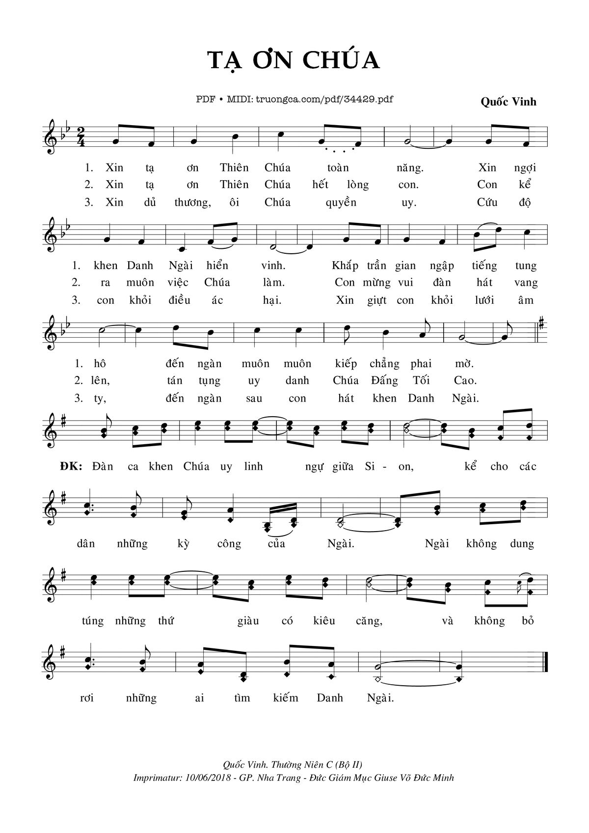 Câu đầu: Xin tạ ơn Thiên Chúa toàn năng Xin ngợi khen Danh Ngài hiển vinh