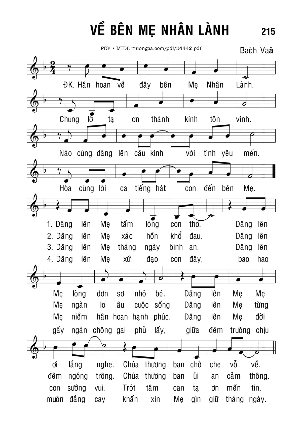 Câu đầu: Hân hoan về đây bên Mẹ Nhân Lành Chung lời tạ ơn thành kính tôn vinh