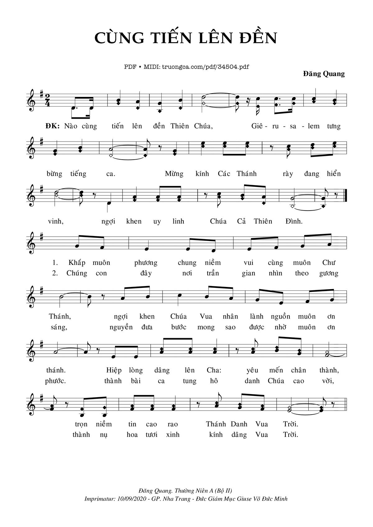 Điệp khúc. Nào cùng tiến lên đền Thiên Chúa, Giêrusalem tưng bừng tiếng ca. Mừng kính Các Thánh rày đang hiển vinh, ngợi khen uy linh Chúa Cả Thiên Đình.