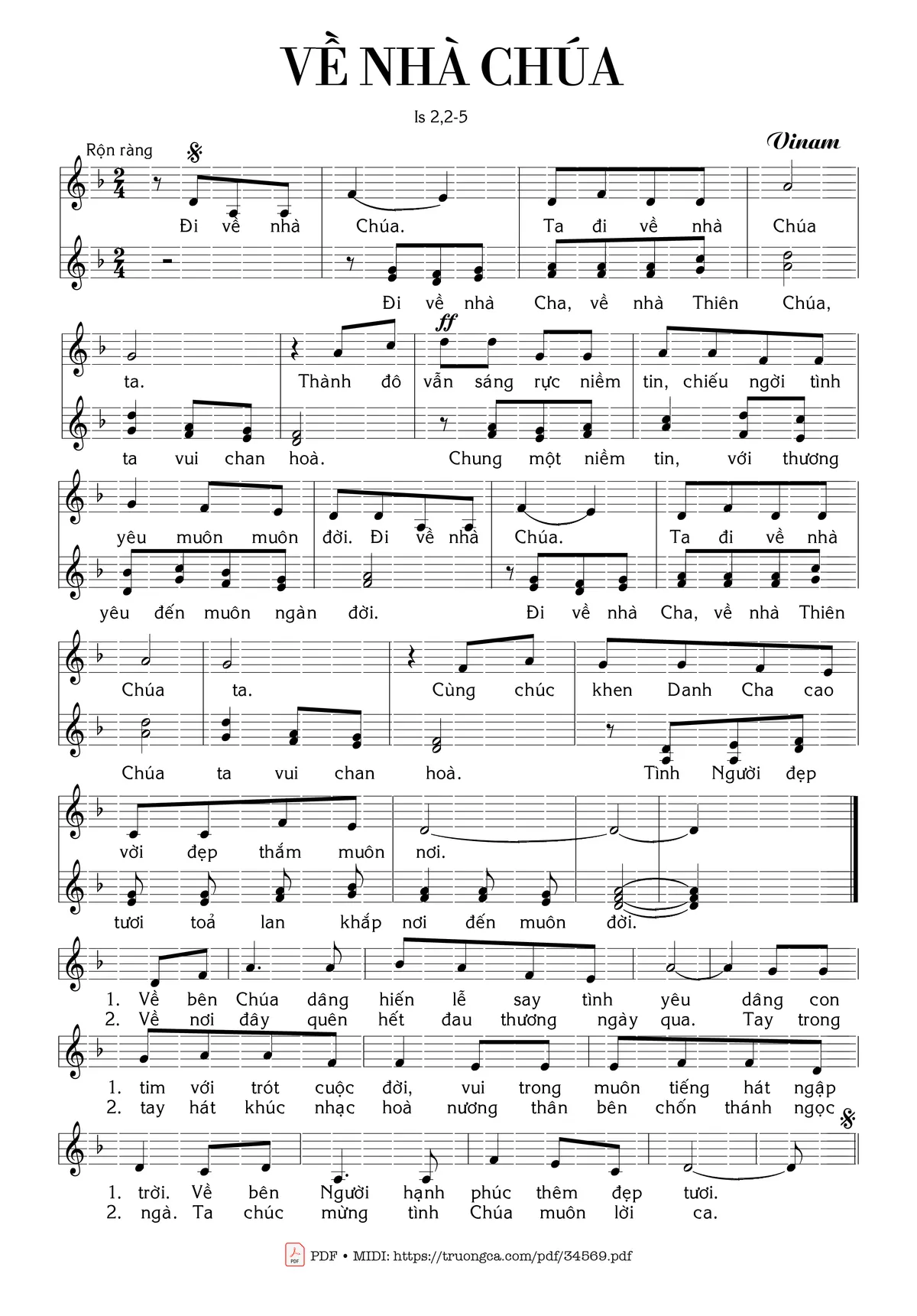 Điệp khúc: Đi về nhà Chúa (Đi về nhà Chúa). Ta đi về nhà Chúa ta (vui chan hoà). Thành đô vẫn sáng rực niềm tin chiếu ngời tình yêu muôn muôn đời. Đi về nhà Chúa (Đi về nhà Chúa). Ta đi về nhà Chúa ta (vui chan hoà). Cùng chúc khen danh Cha cao vời đẹp thắm muôn nơi (đến muôn nơi).