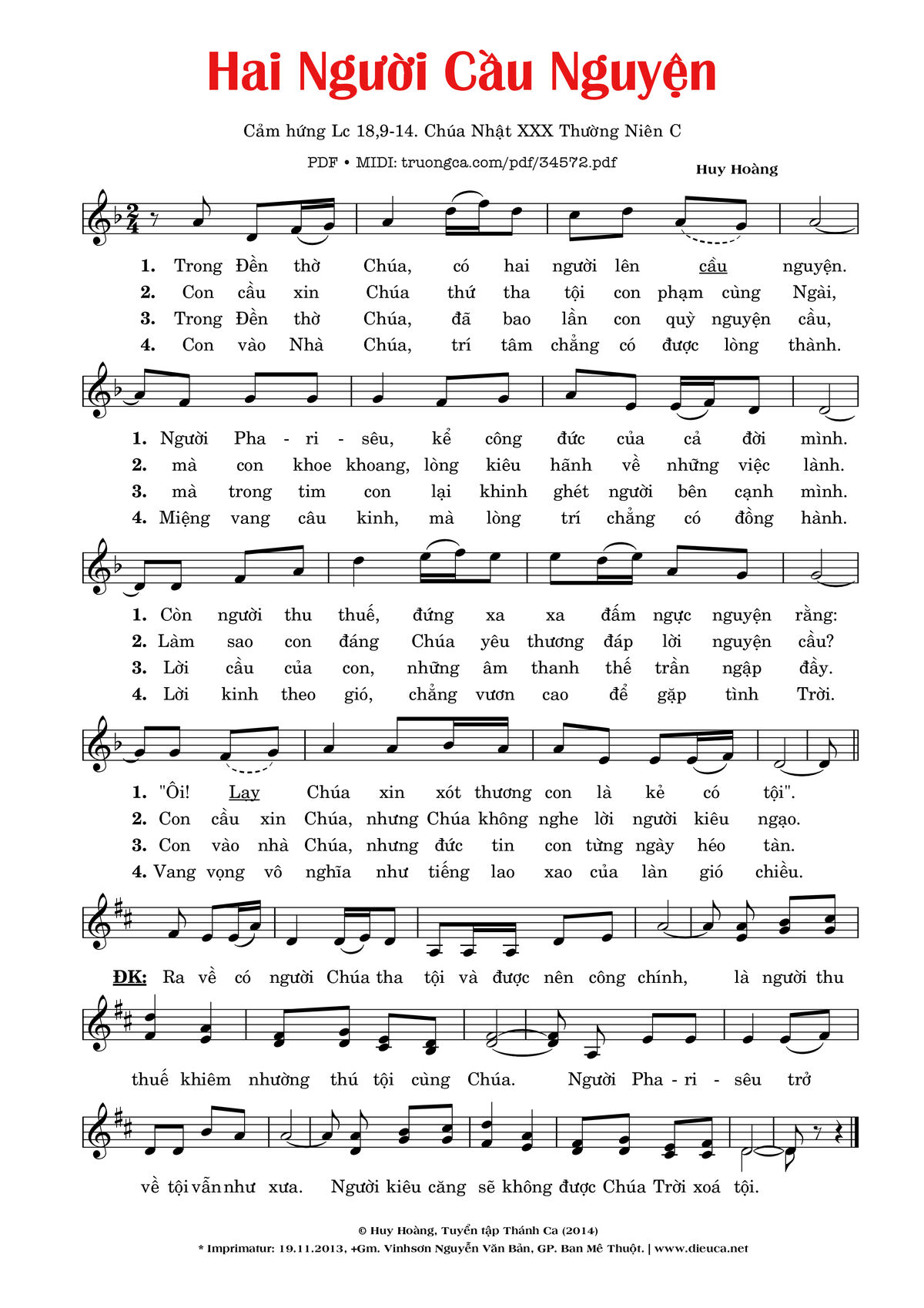 1. Trong Đền thờ Chúa, có hai người lên cầu nguyện. Người Pha-ri-sêu, kể công đức của cả đời mình. Còn người thu thuế, đứng xa xa đấm ngực nguyện rằng: . \nĐiệp khúc: Ra về có người Chúa tha tội và được nên công chính, là người thu thuế khiêm nhường thú tội cùng Chúa. Người Pha-ri-sêu trở về tội vẫn như xưa. Người kiêu căng sẽ không được Chúa Trời xoá tội. \n2. Con cầu xin Chúa thứ tha tội con phạm cùng Ngài, mà con khoe khoang, lòng kiêu hãnh về những việc lành. Làm sao con đáng Chúa yêu thương đáp lời nguyện cầu? Con cầu xin Chúa, nhưng Chúa không nghe lời người kiêu ngạo. \n3. Trong Đền thờ Chúa, đã bao lần con quỳ nguyện cầu, mà trong tim con lại khinh ghét người bên cạnh mình. Lời cầu của con, những âm thanh thế trần ngập đầy. Con vào nhà Chúa, nhưng đức tin con từng ngày héo tàn. \n4. Con vào Nhà Chúa, trí tâm chẳng có được lòng thành. Miệng vang câu kinh, mà lòng trí chẳng có đồng hành. Lời kinh theo gió, chẳng vươn cao để gặp tình Trời. Vang vọng vô nghĩa như tiếng lao xao của làn gió chiều.\n-------------------------------------------------------------------------------- \n\n \n\n\n\n\n 🌾 Thông tin chuẩn nhận dùng trong phụng vụ Công Giáo: Imprimatur: 19.11.2013, +Gm. Vinhsơn Nguyễn Văn Bản, GP. Ban Mê Thuột.\n \n \n