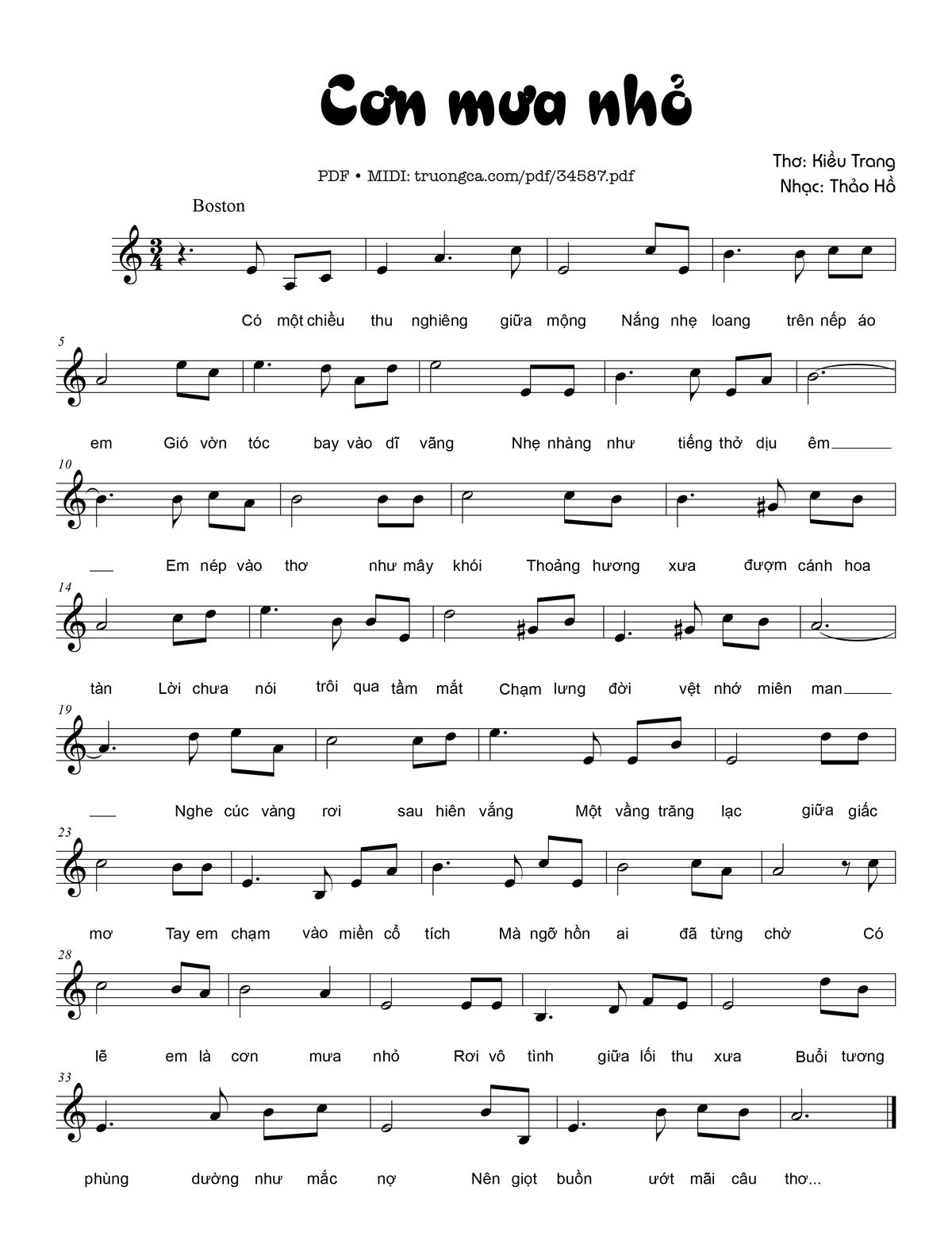 Thảo Hồ Có một chiều thu nghiêng giữa mộng Nắng nhẹ loang trên nếp áo em [PDF] [Sheet] [Lời H.A] [Mp4/Midi]