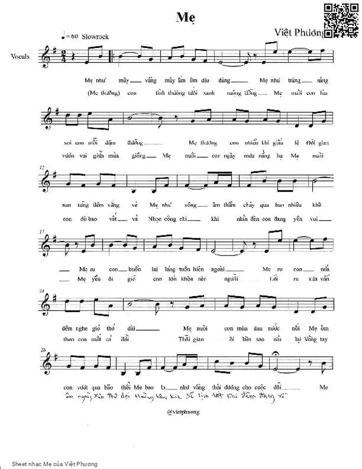 Việt Phương Mẹ như mây vầng mây ấm êm dịu dàng [PDF] [Sheet] [Lời H.A] [Mp4/Midi]