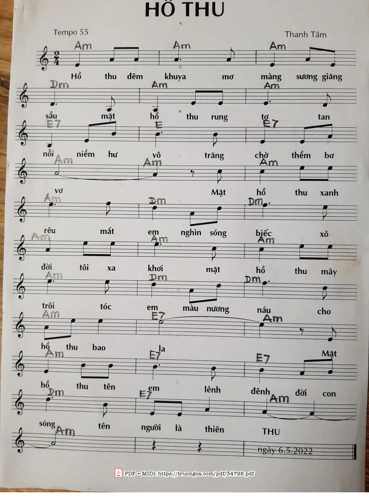 Phan Thanh Tâm Hồ thu đêm khuya Mơ màng sương giăng sầu [PDF] [Sheet] [Lời H.A] [Mp4/Midi]