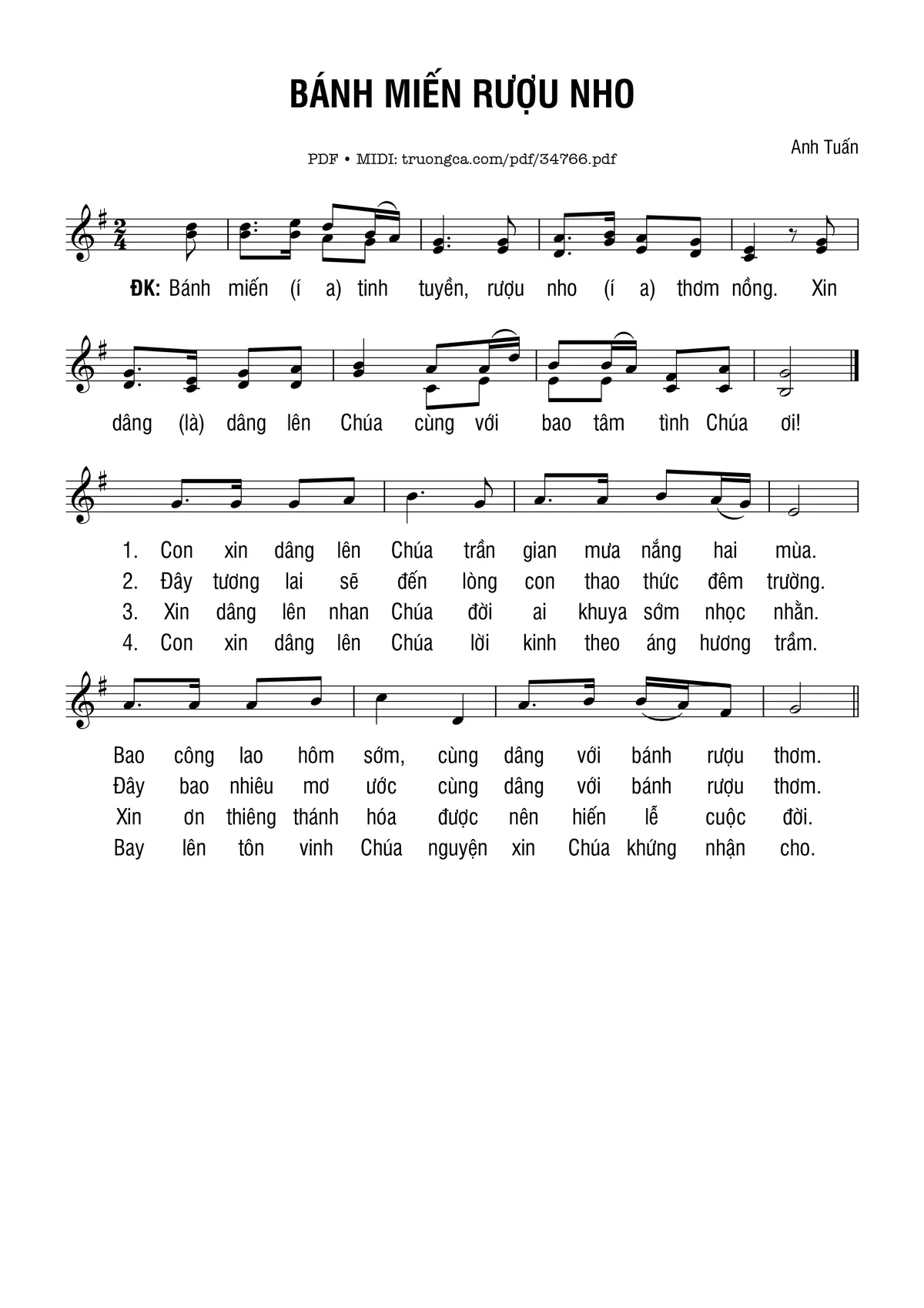 Điệp khúc: Bánh miến (í a) tinh tuyền, rượu nho (í a) thơm nồng. Xin dâng (là) dâng lên Chúa cùng với bao tâm tình Chúa ơi!