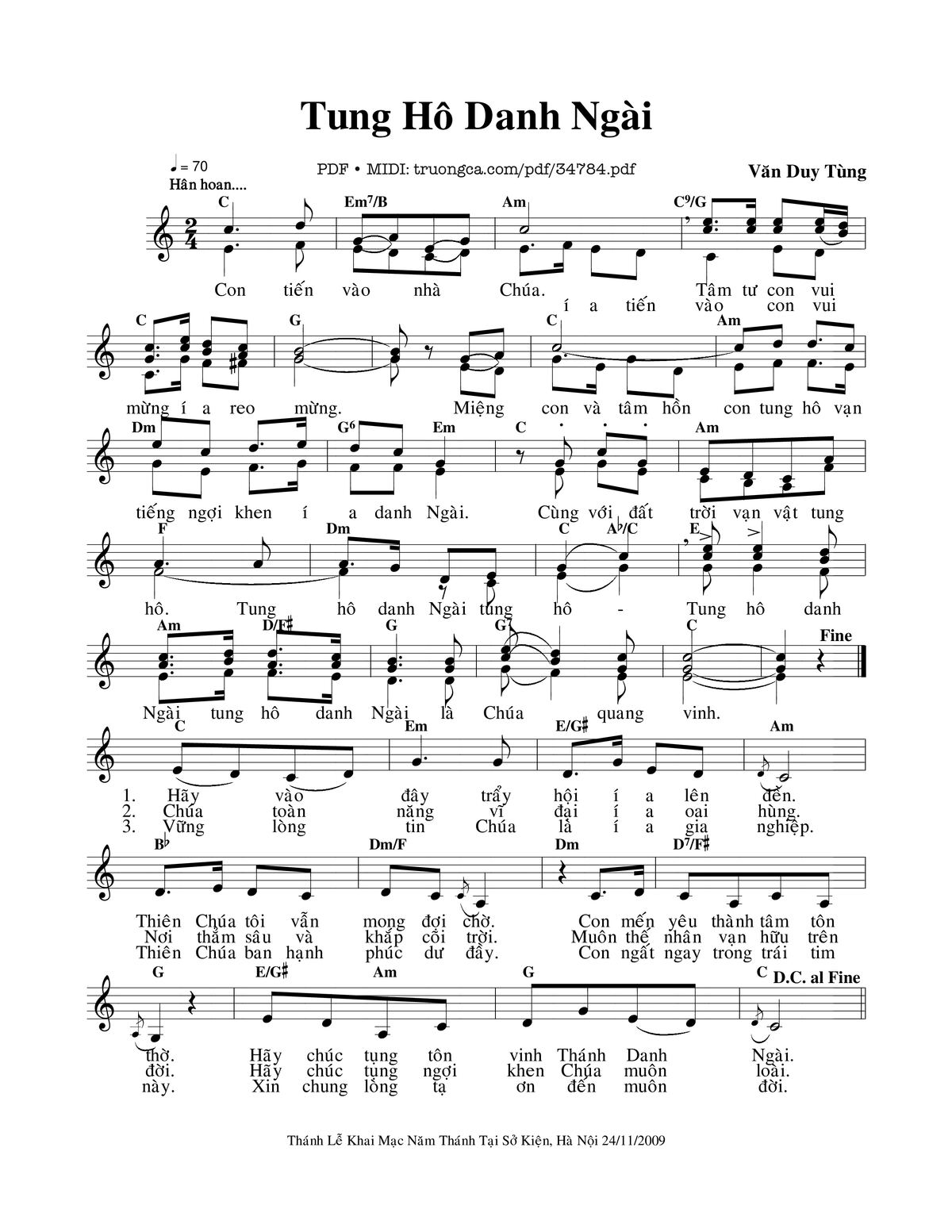 Điệp khúc. Con tiến vào nhà Chúa, tâm tư con vui mừng reo mừng. Miệng con và tâm hồn con tung hô vạn tiếng ngợi khen Danh Ngài. Cùng với đất trời vạn vật tung hô. Tung hô danh Ngài tung hô. Tung hô danh Ngài, tung hô danh Ngài là Chúa quang vinh.